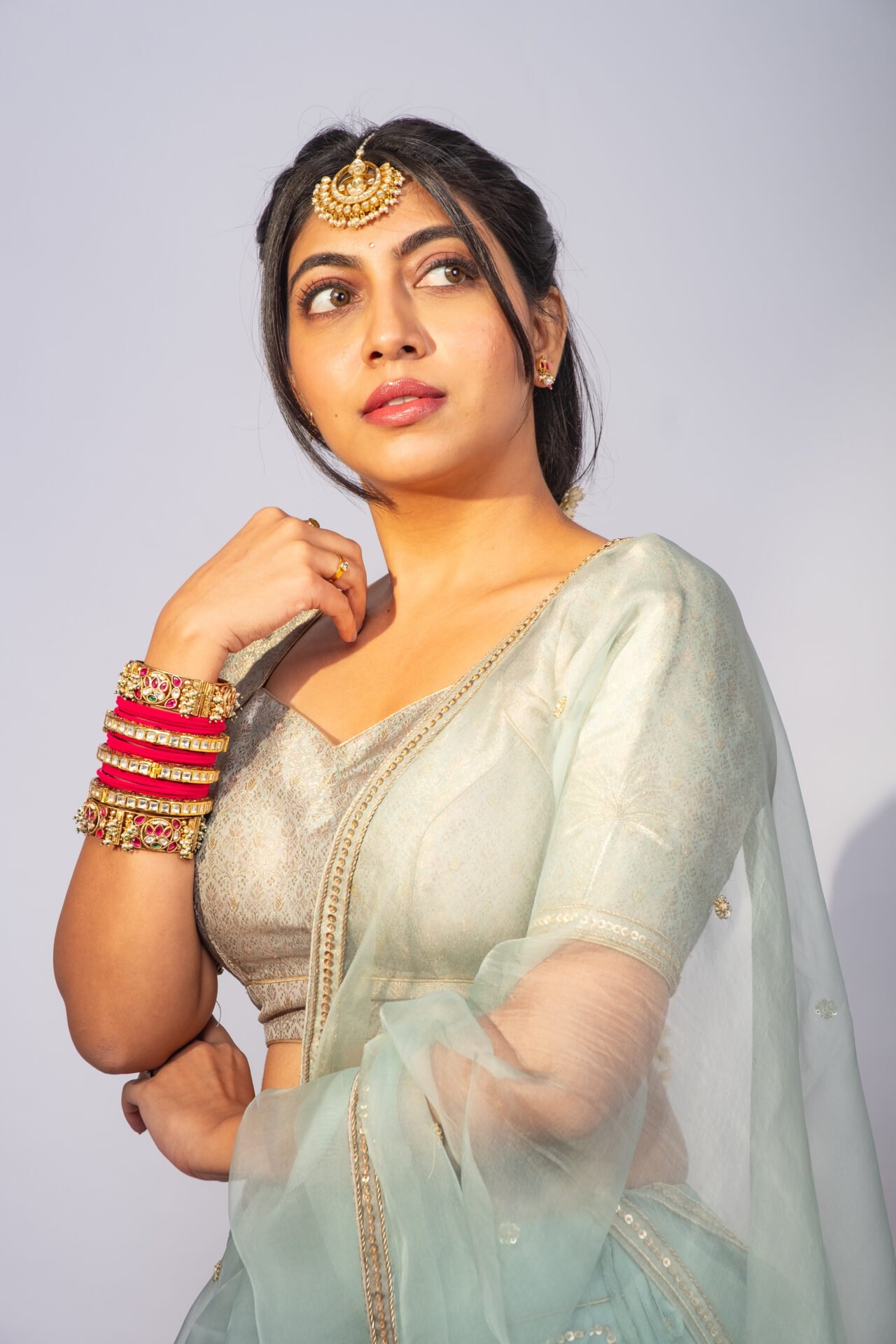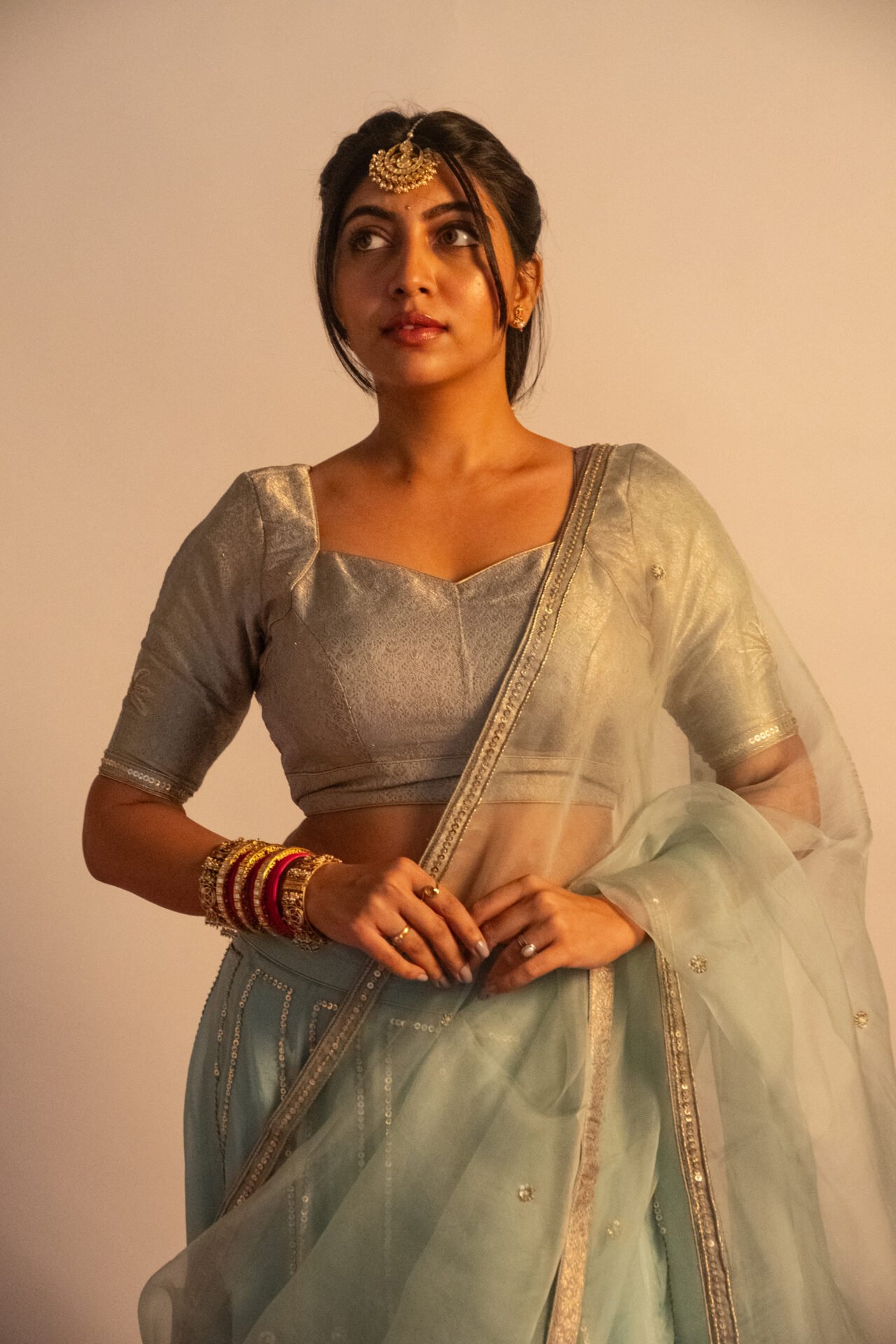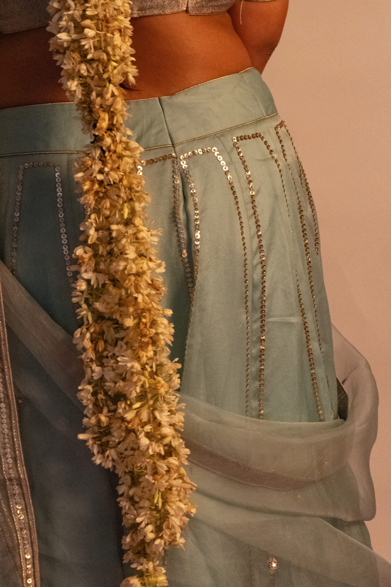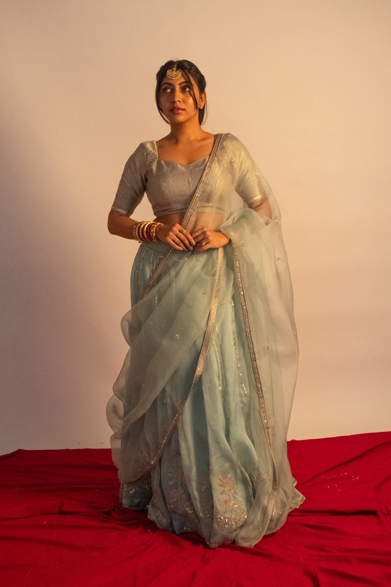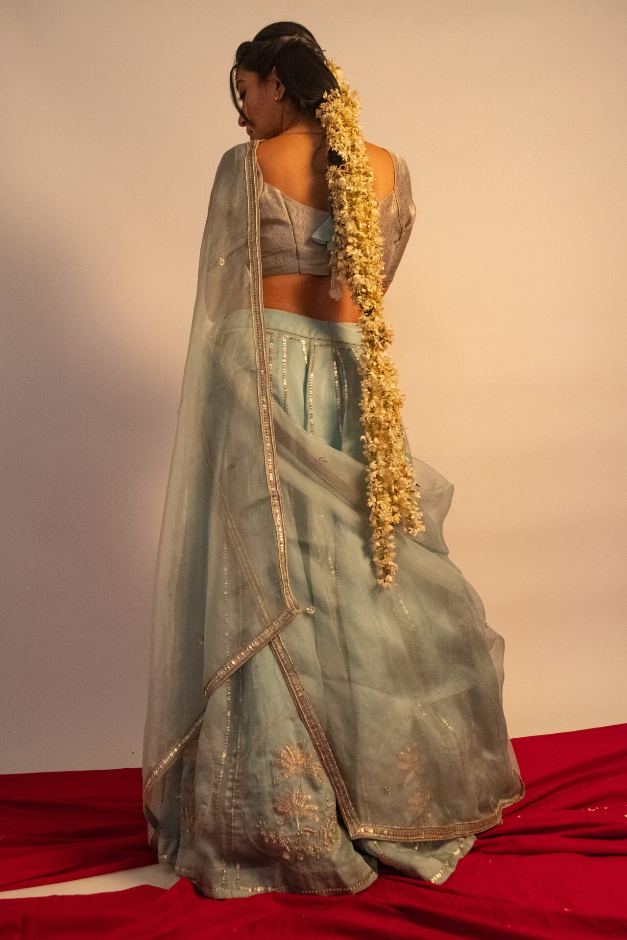 Ash Blue Lehenga with tropical inspired hand work motifs paired with banarasi blouse and matching organza dupatta. A captivating blend of sophistication and allure. Crafted from organza & banarasi fabric, this set is designed to make a statement at any occasion.