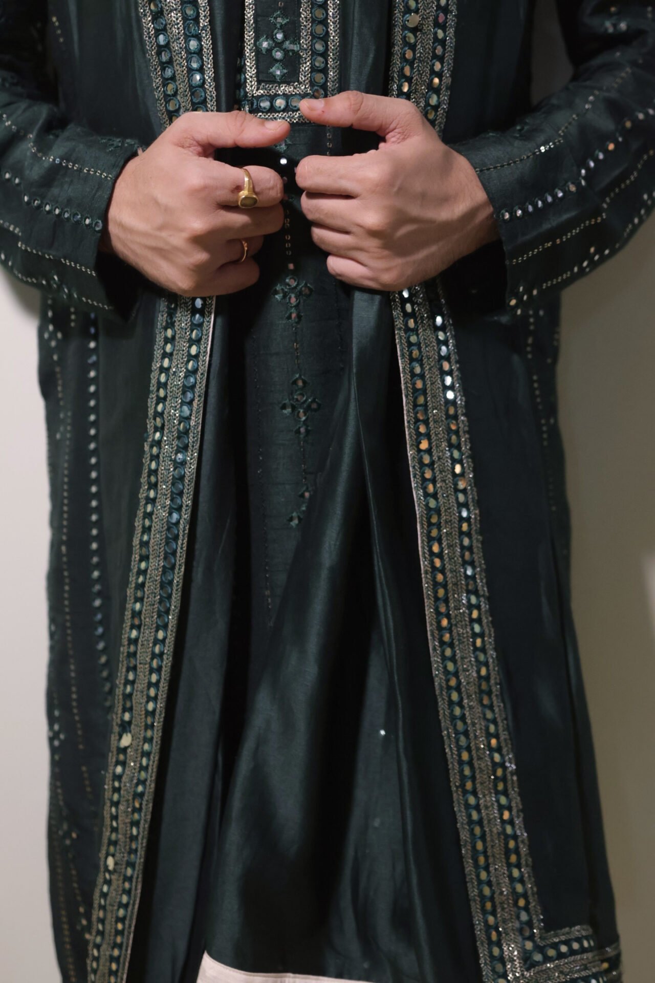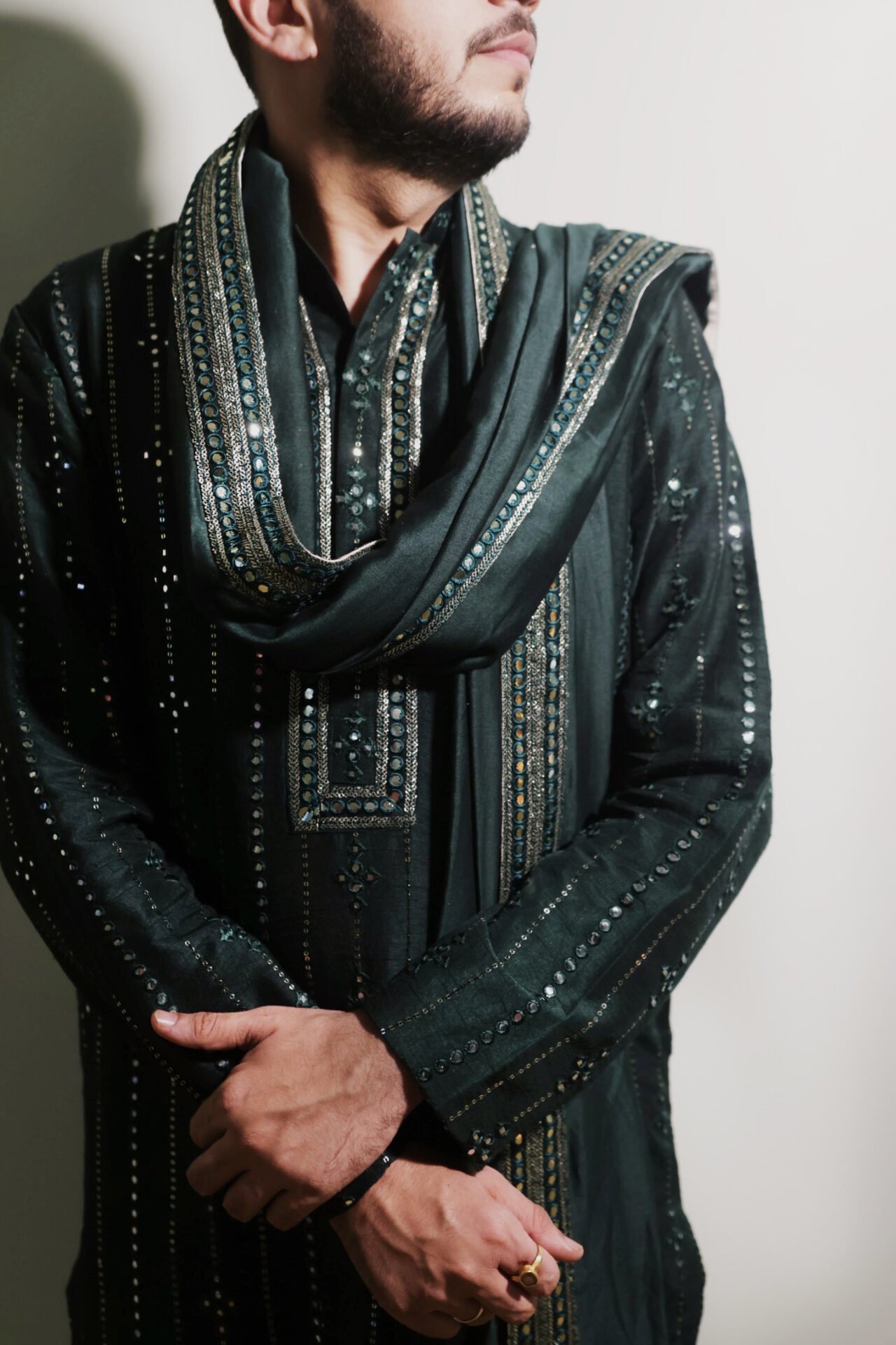 Bottle Green Kurta Set with mirror work all over paired with Off White Salwar and mirror work border Chanderi Silk Dupatta.
