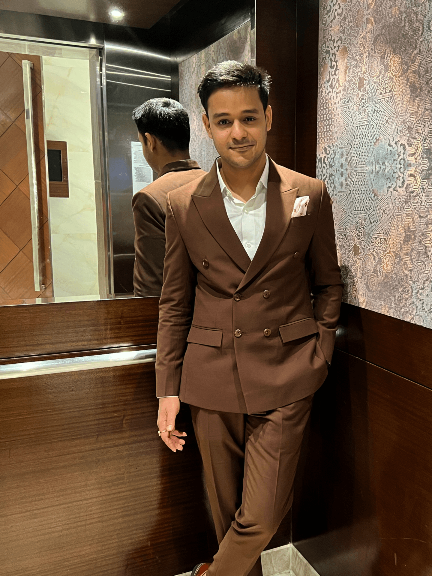 Brown Double Breasted peak lapel Blazer paired with Off White Shirt and Matching Trousers.