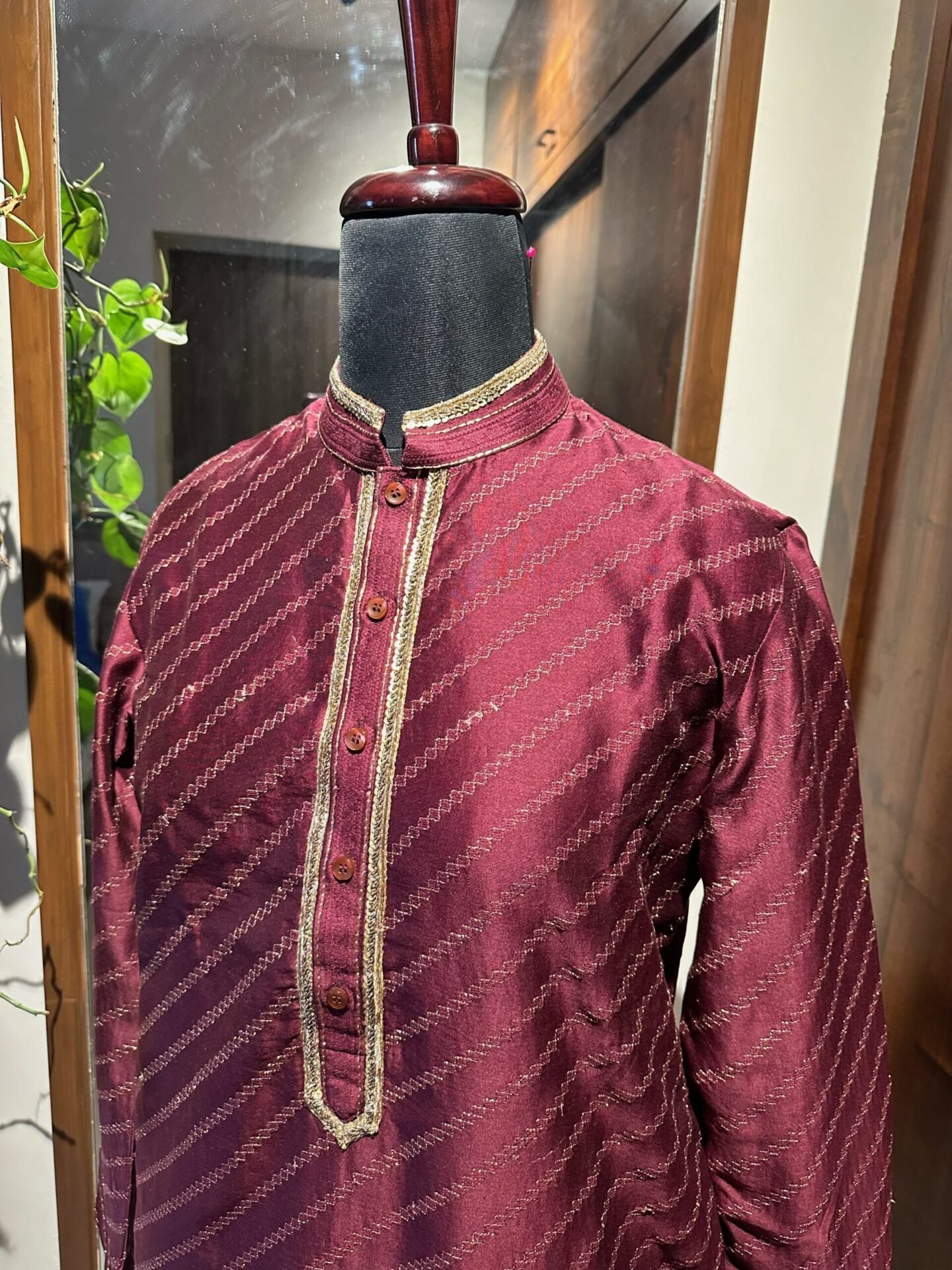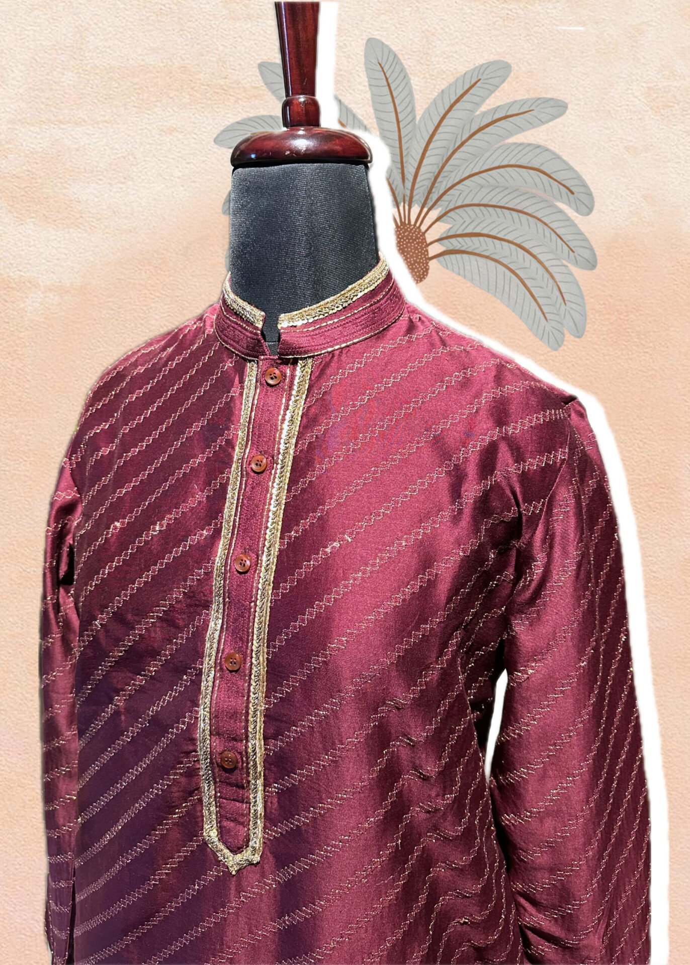 Burgundy Kurta Set with diagonal thread and Gold all over Embroidery paired with Off White Pants.