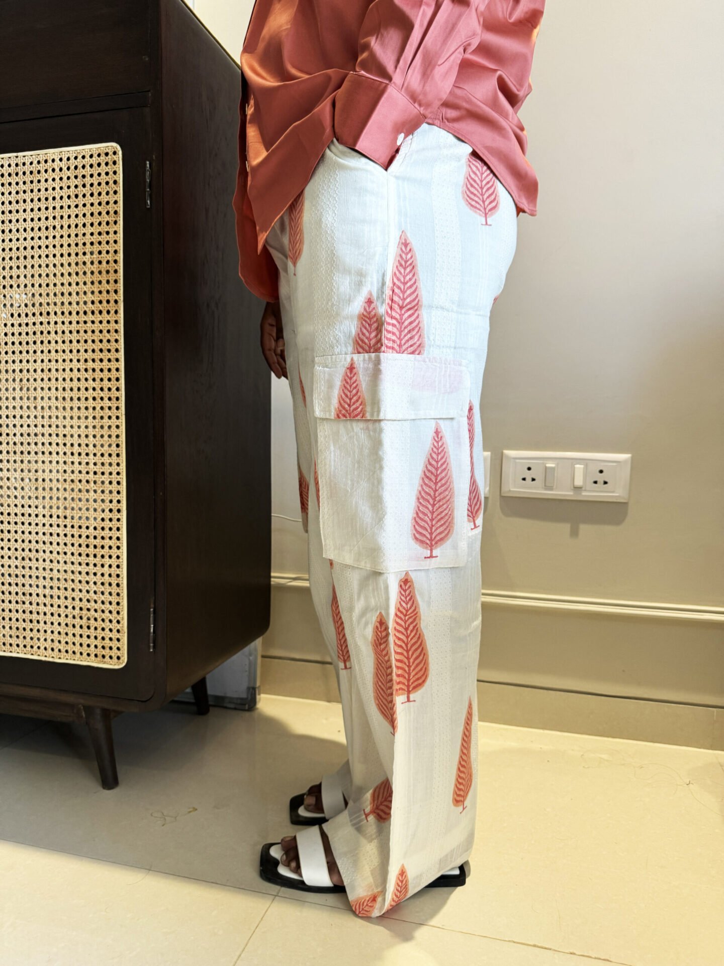 A Cargo Style Co-ord Set including Jaipuri Block Printed Cargo Pant paired with Plain Shirt with Paisley Patchwork.
