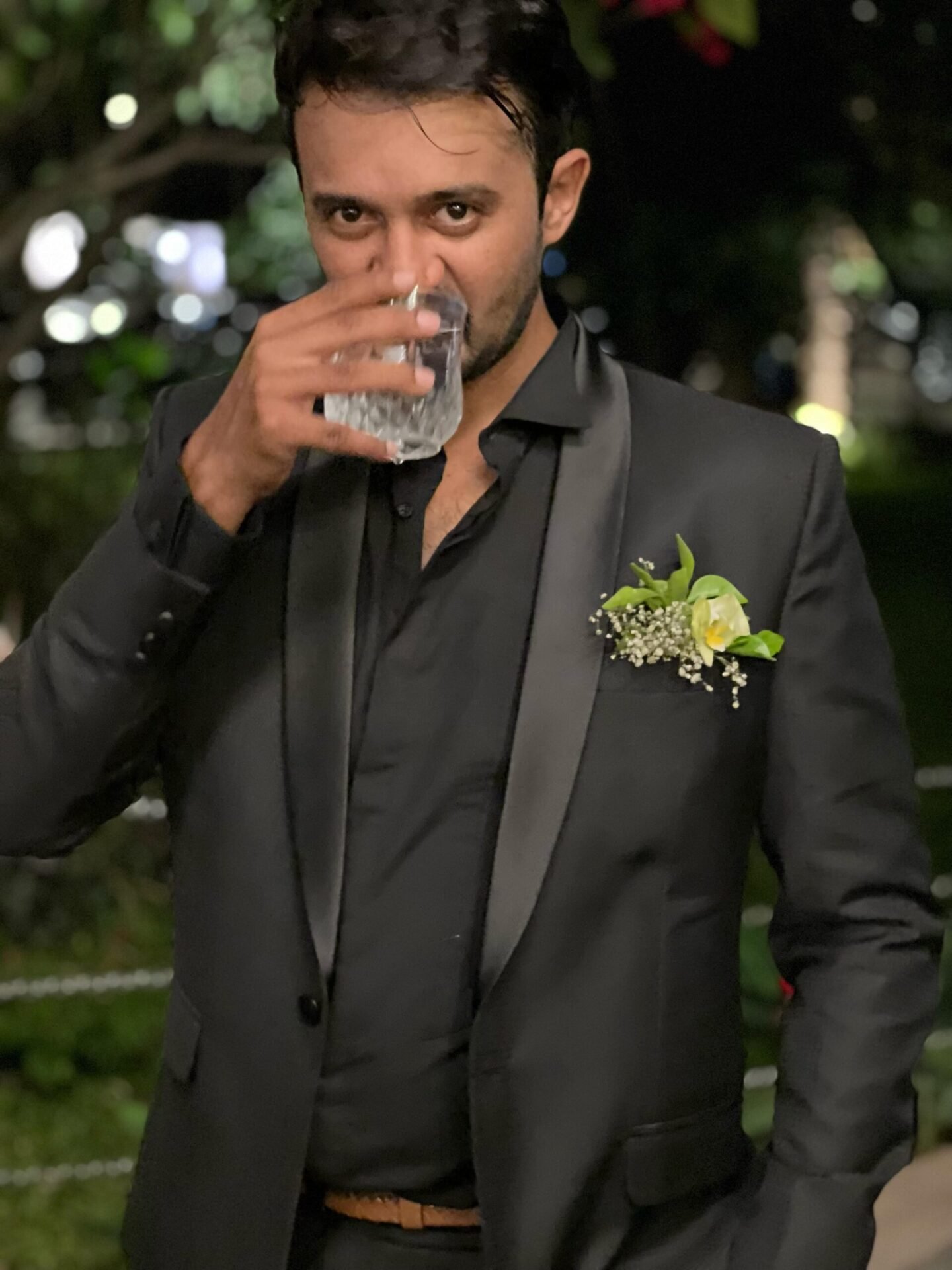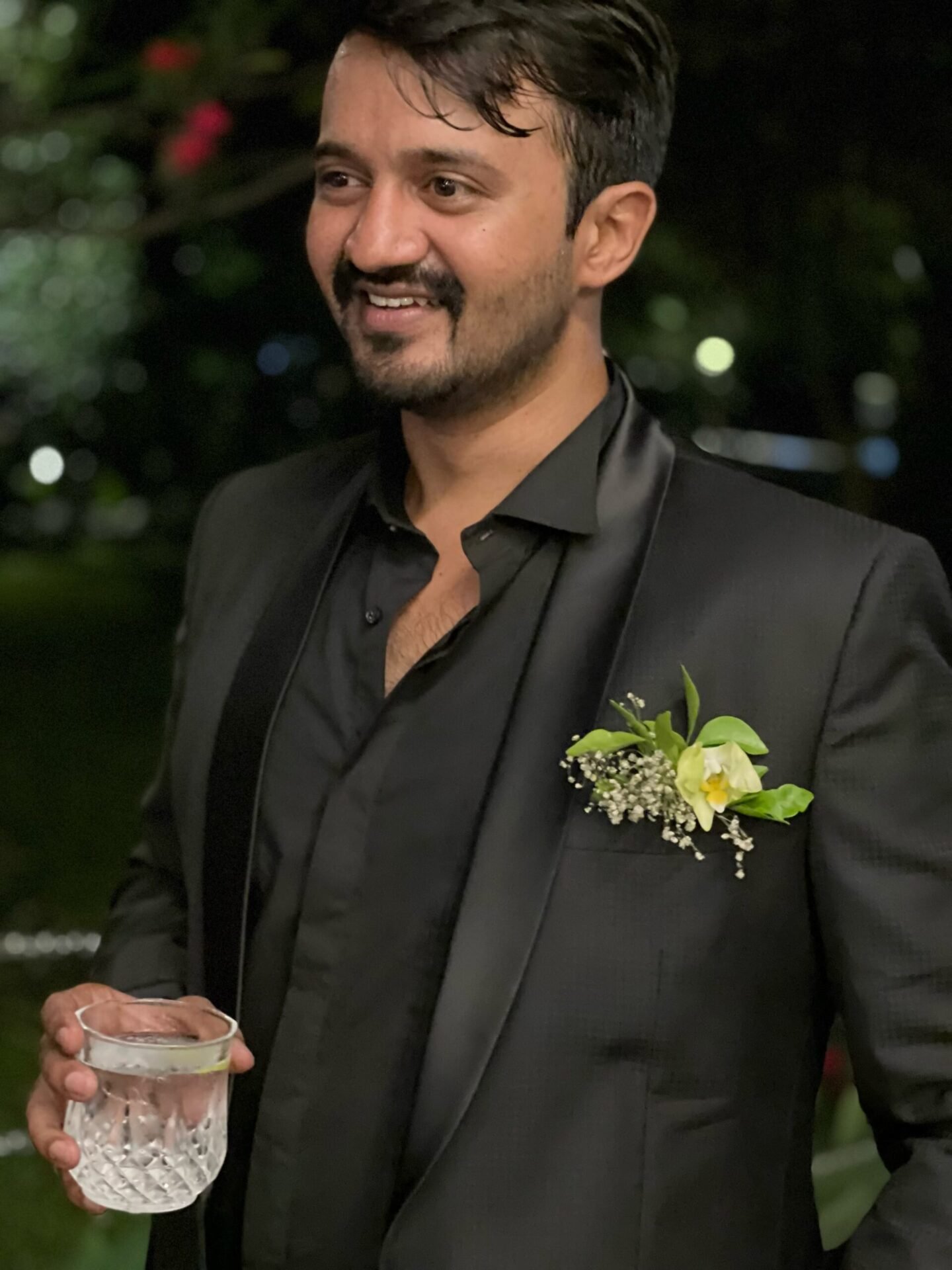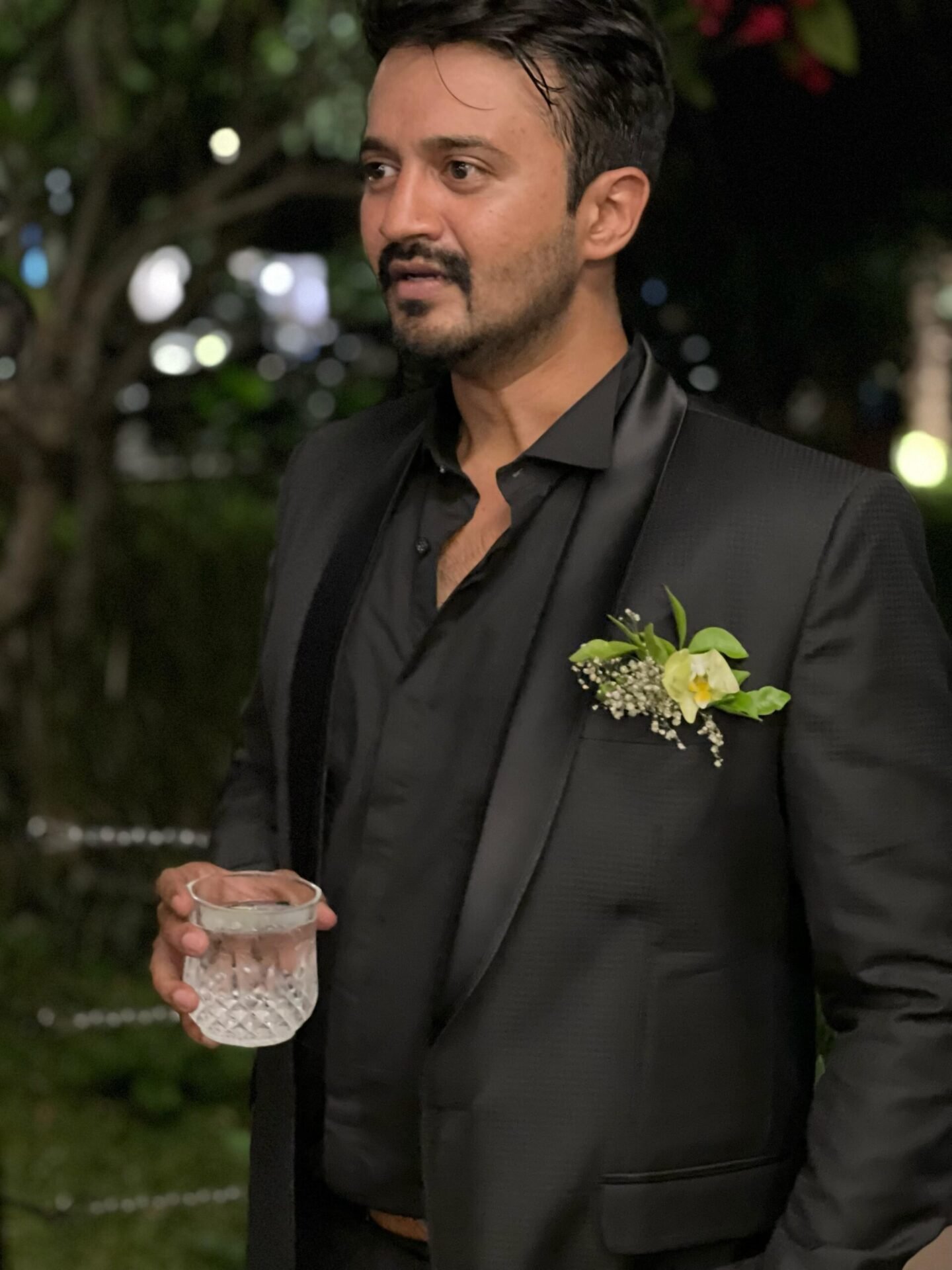 Classic Black Suit with Satin Shawl Collar paired with Tonal Shirt and Trousers.