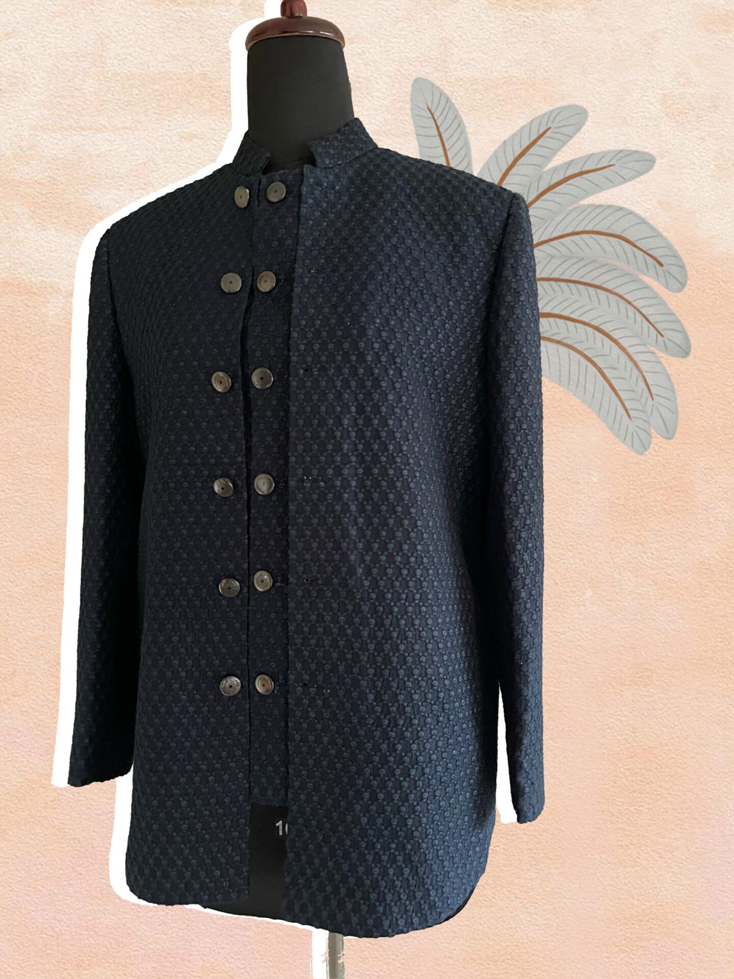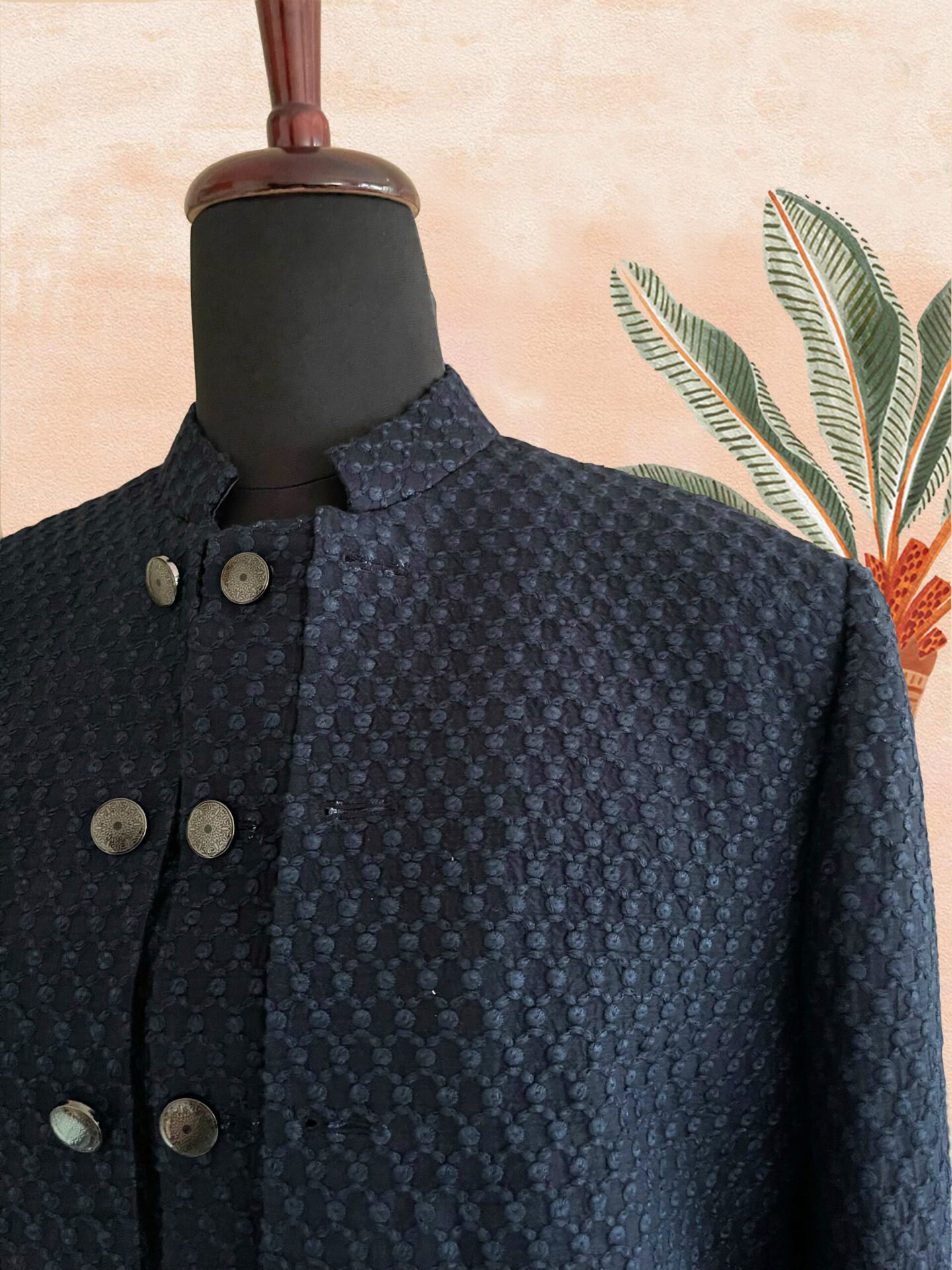 Deep Blue Double layered Jacket Set with Self-geometric embroidery Jacket paired with Deep Blue Trouser and Kurta.
