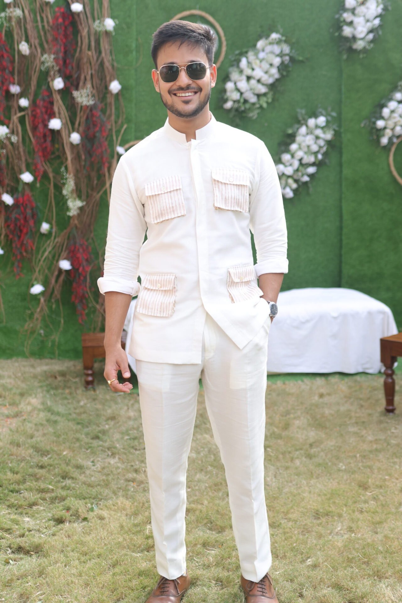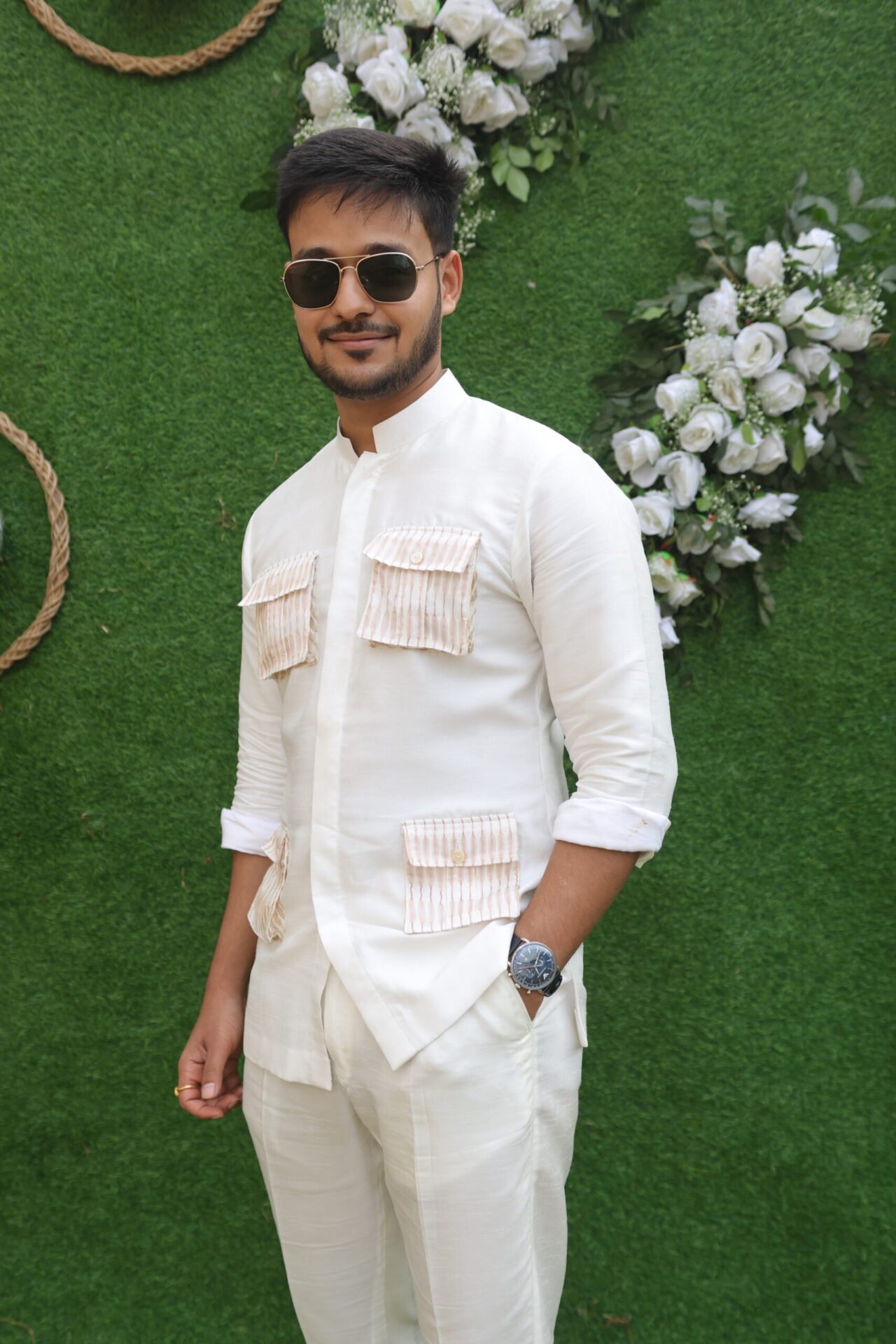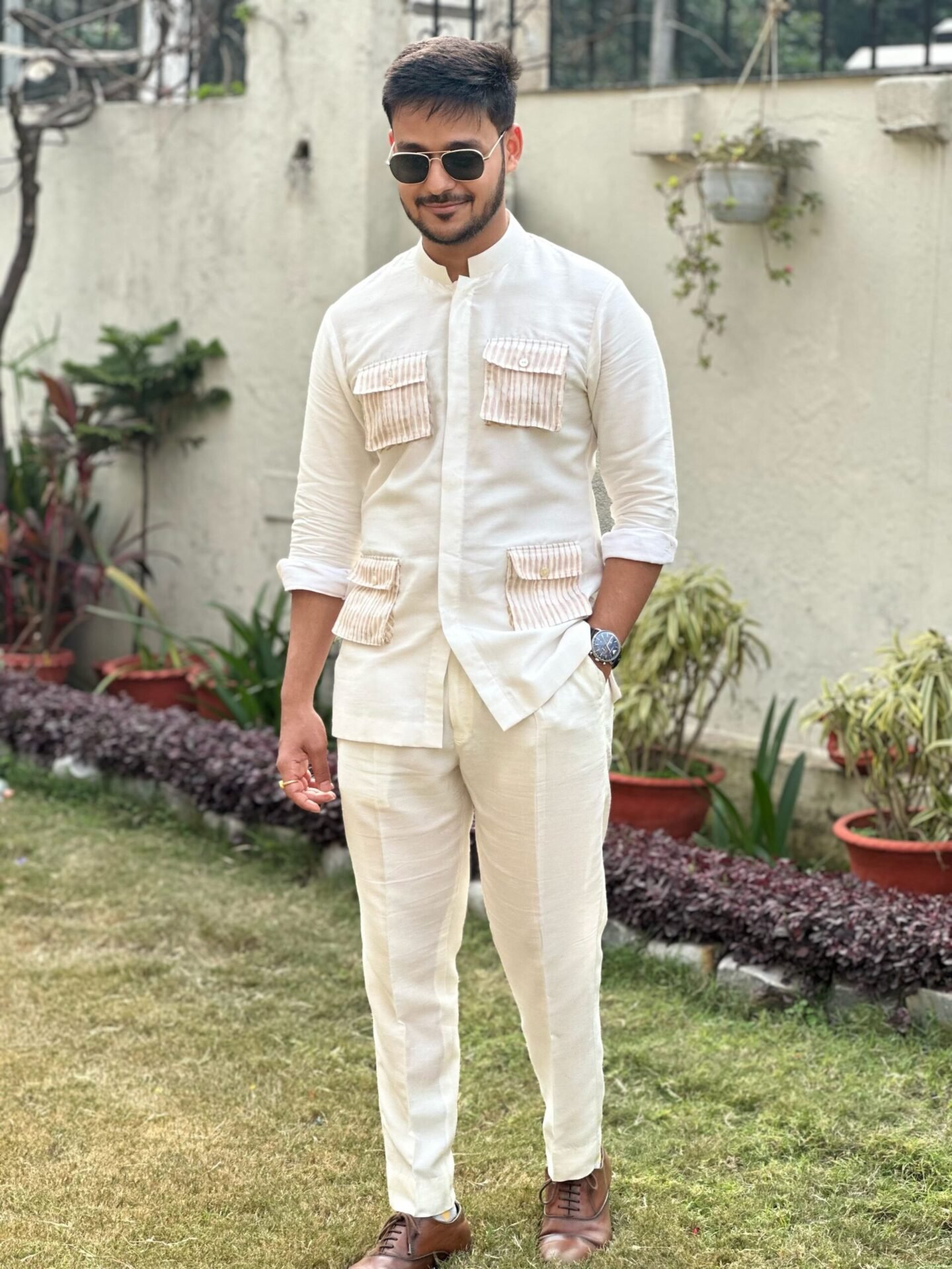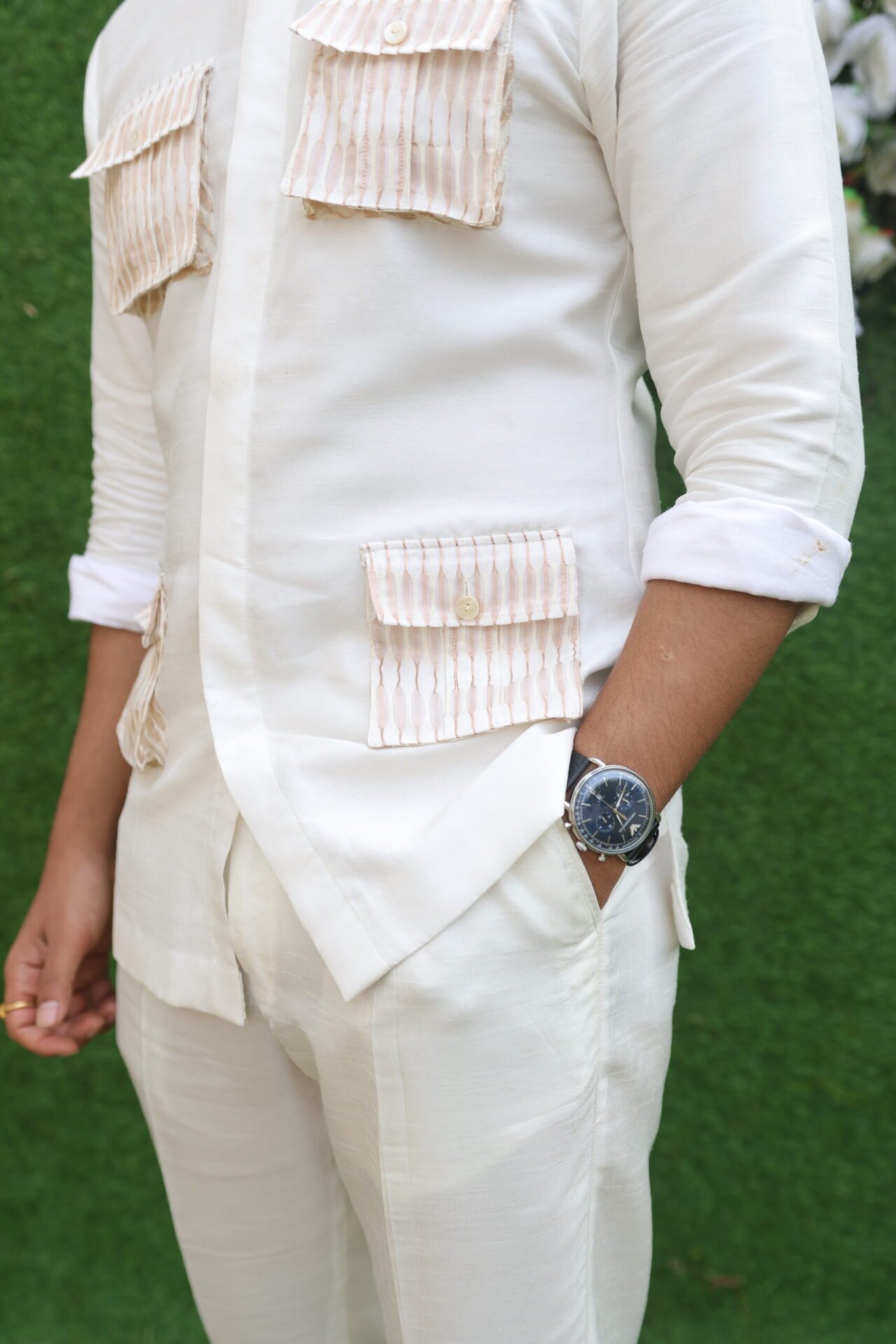 Ecru Safari Shirt with tissue patch pocket paired with matching pants.