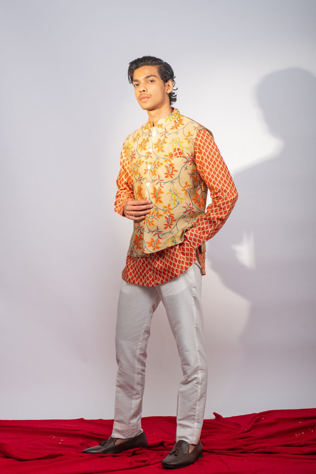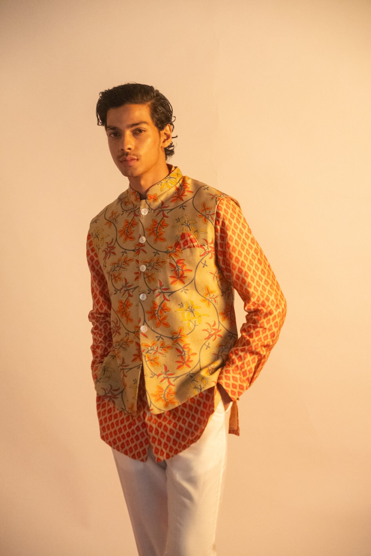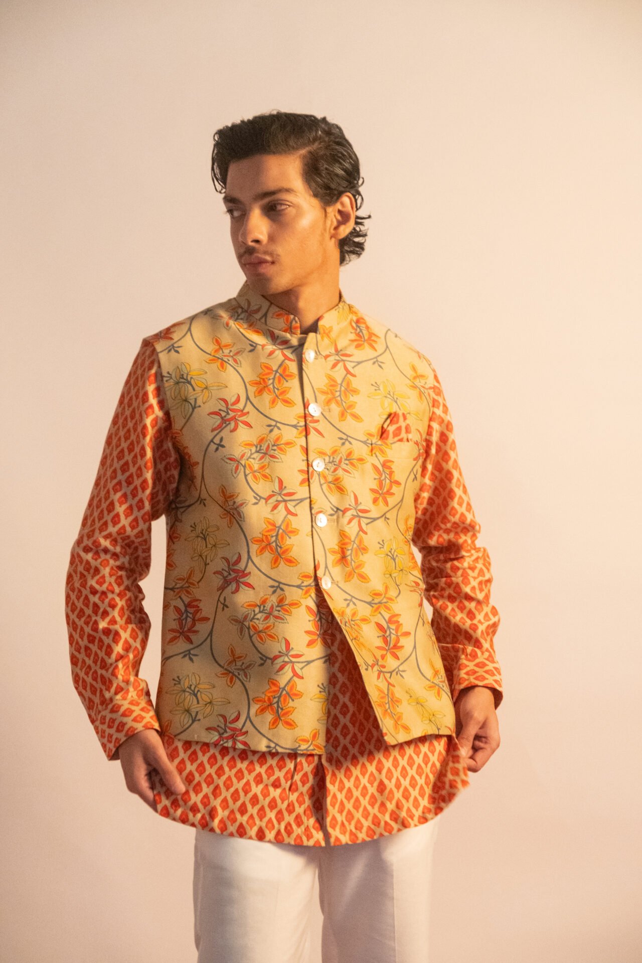 Floral Printed Bundi Jacket paired with Geometric Printed Kurta & Off White Pant.