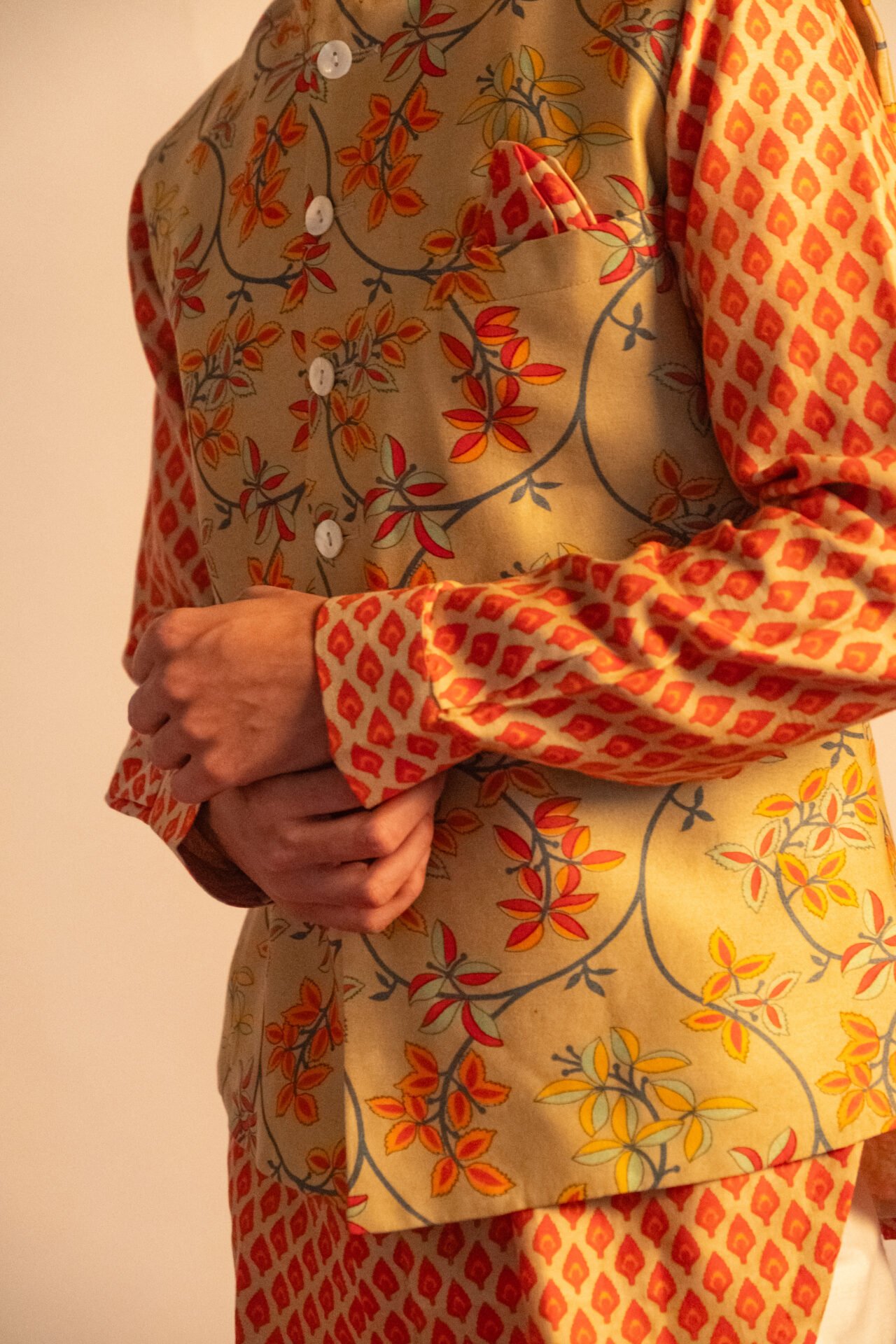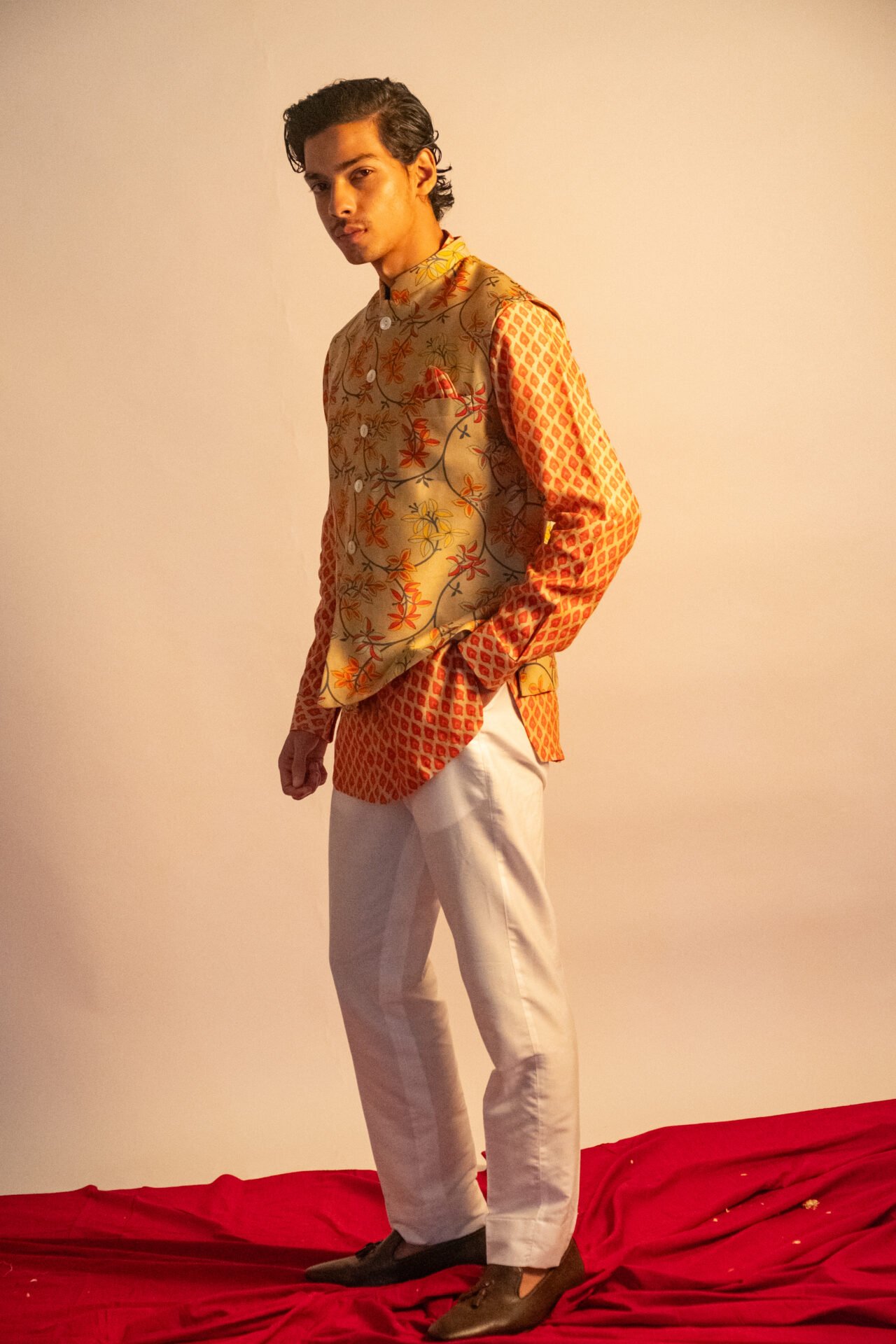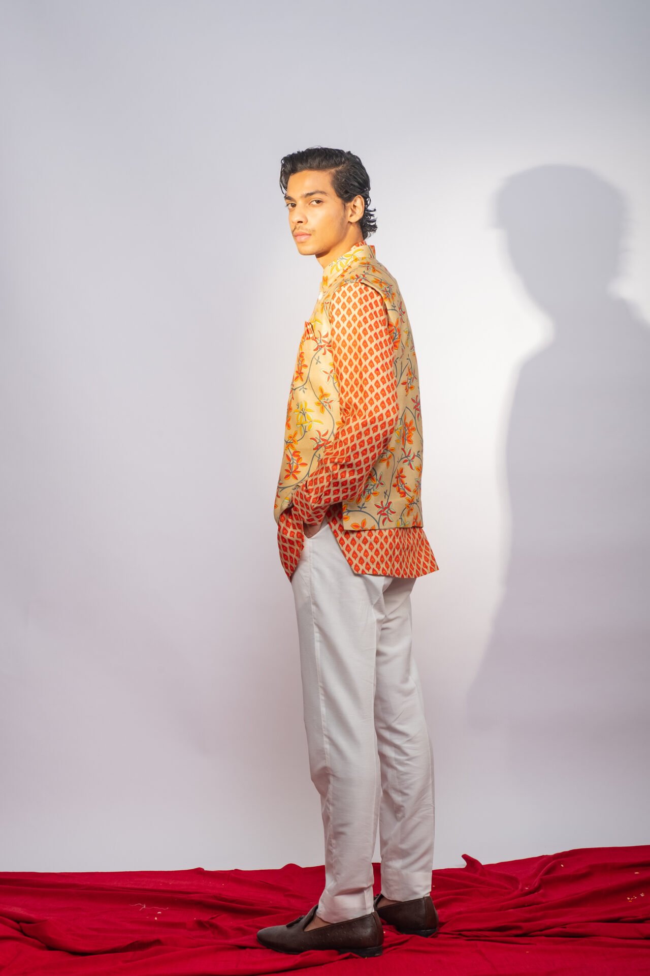 Floral Printed Bundi Jacket paired with Geometric Printed Kurta & Off White Pant.