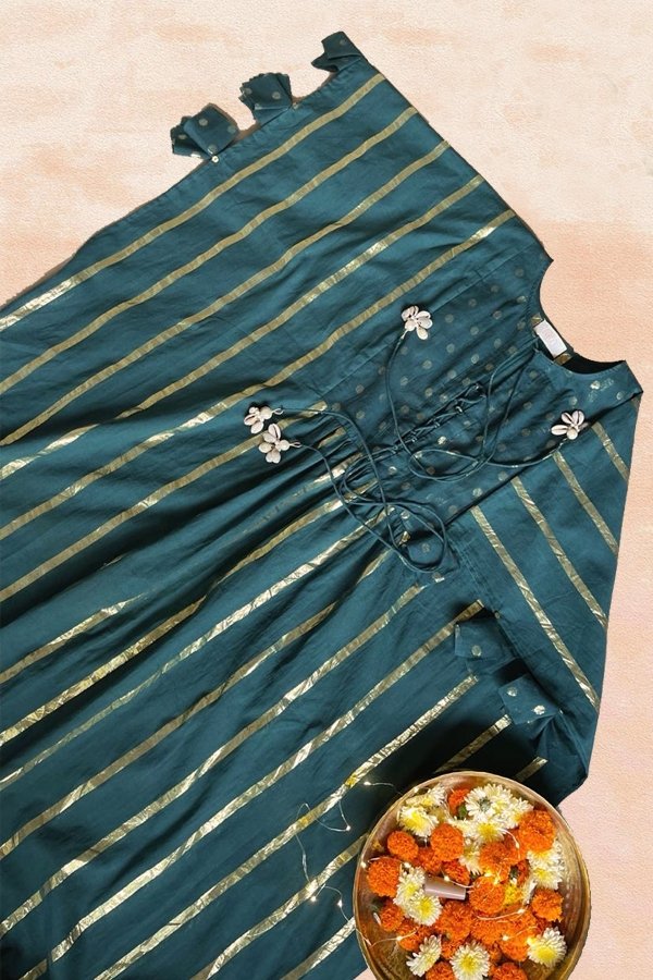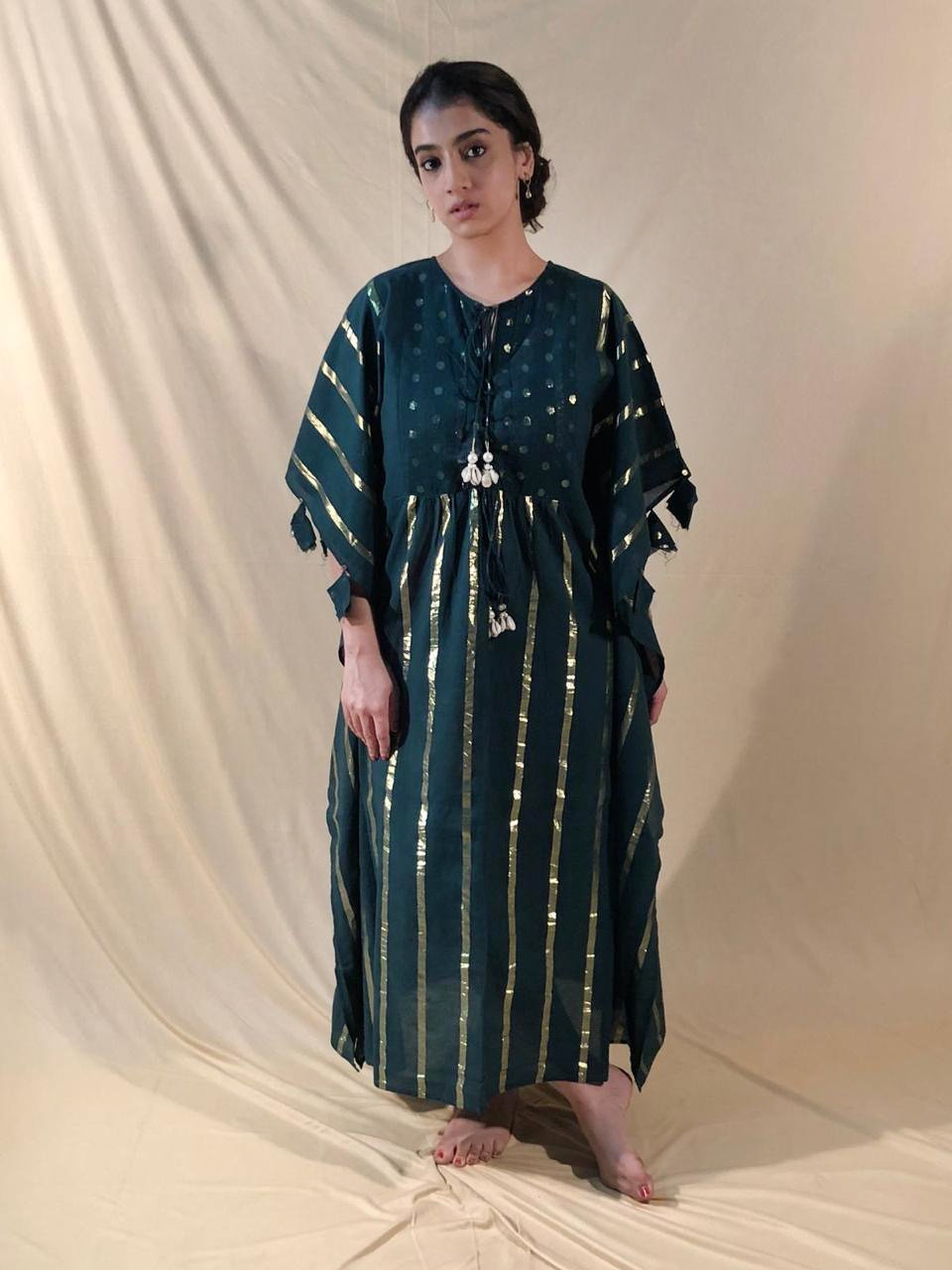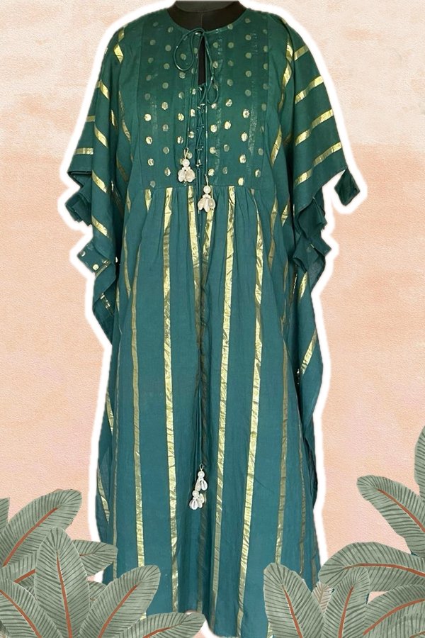 Dark Green Kaftan with Gold Stripes and Matching Yoke. A captivating blend of Sophistication and Allure. Crafted from Soft Cotton Fabric.