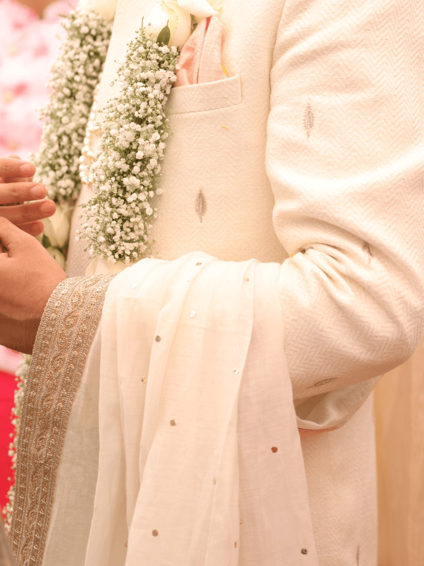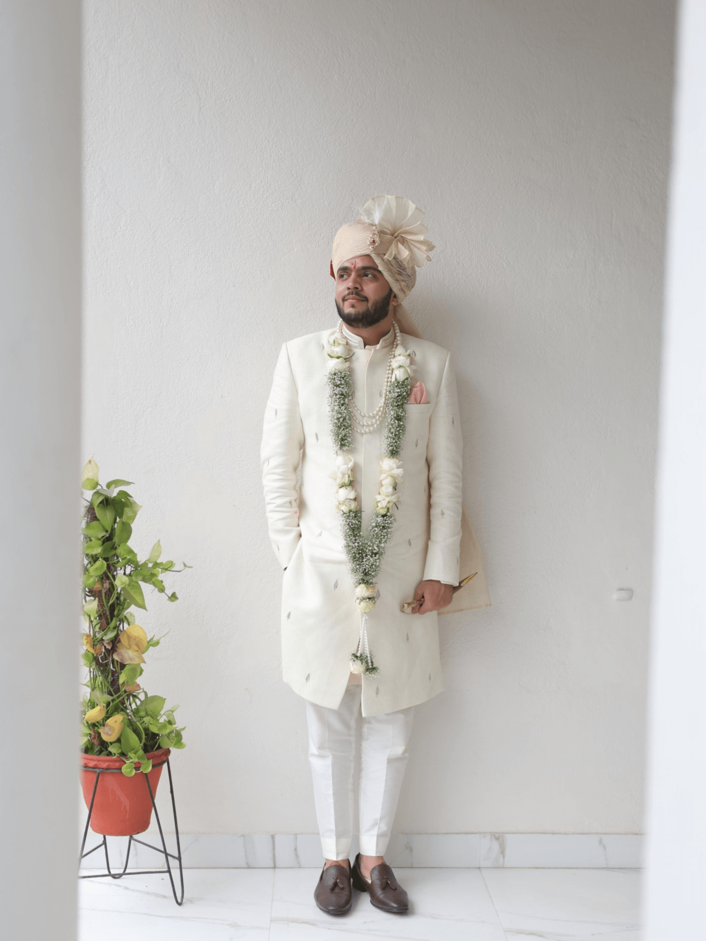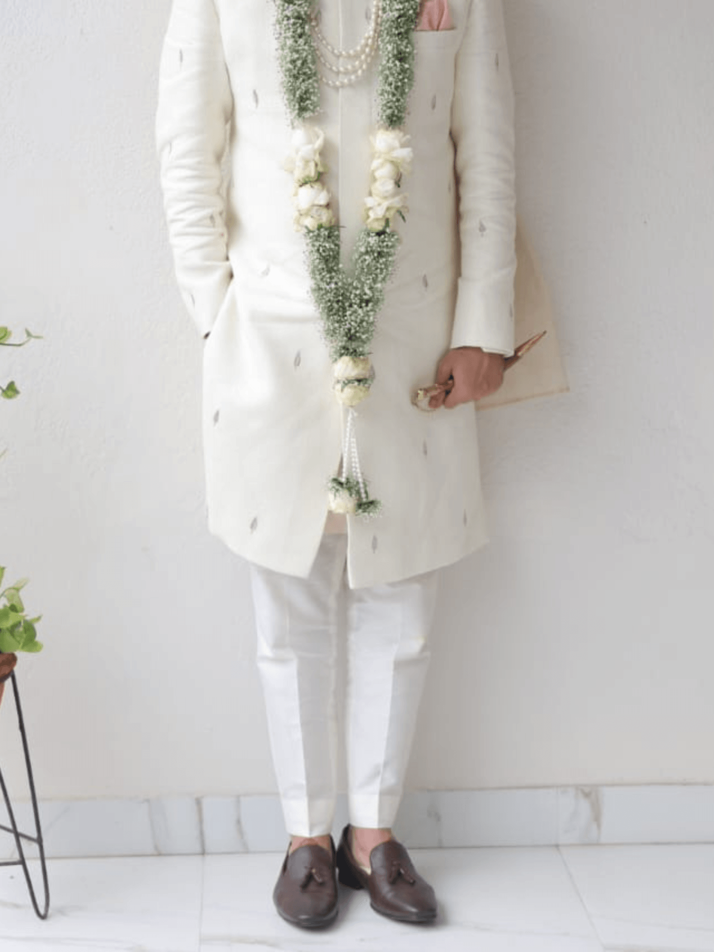 Textured Ivory Sherwani embellished with Hand Embroidered Leaf Motifs & Ornate-collar Embroidery paired with Tonal Kurta, Pants & Mukaish work Chanderi Dupatta.