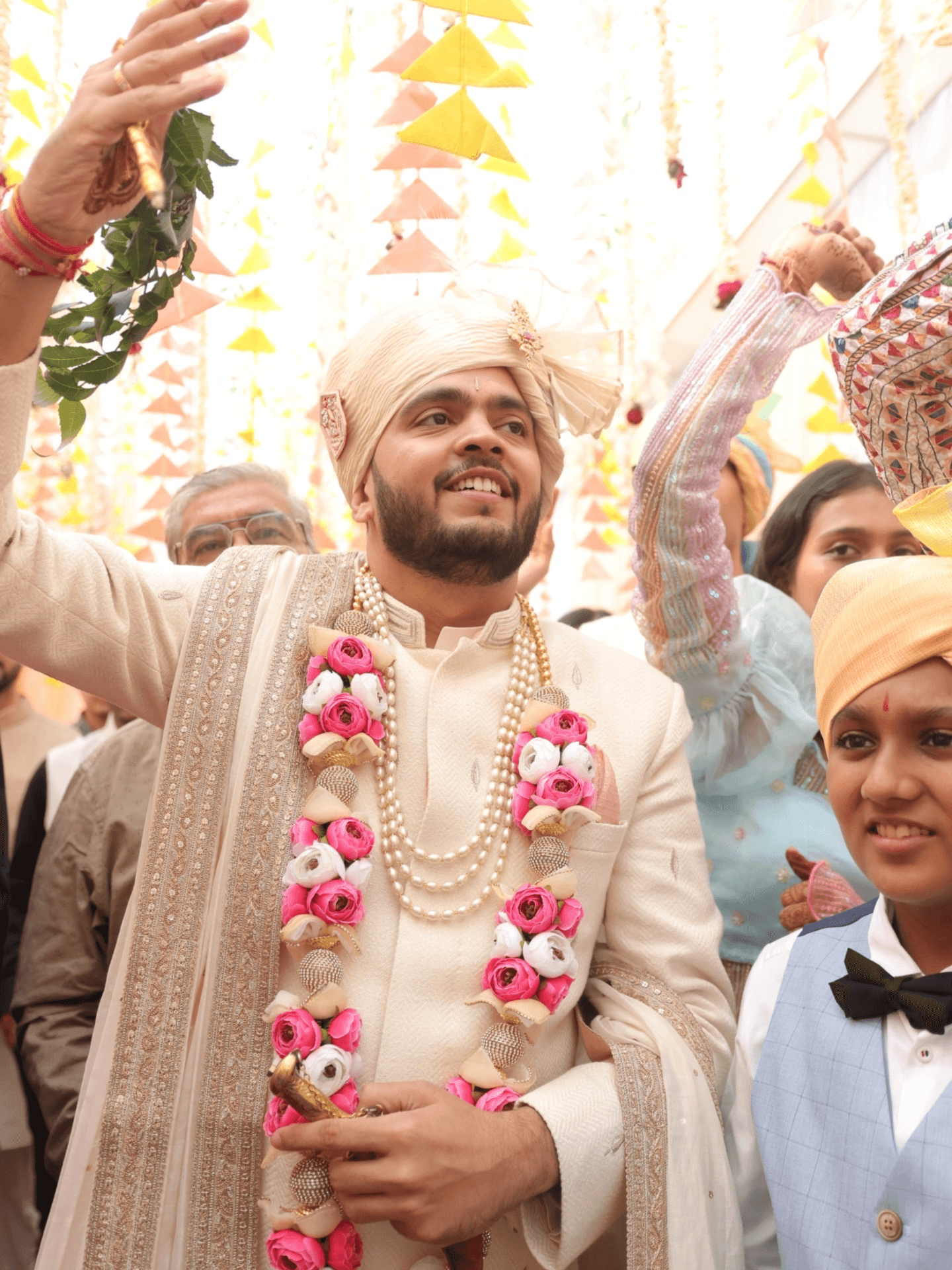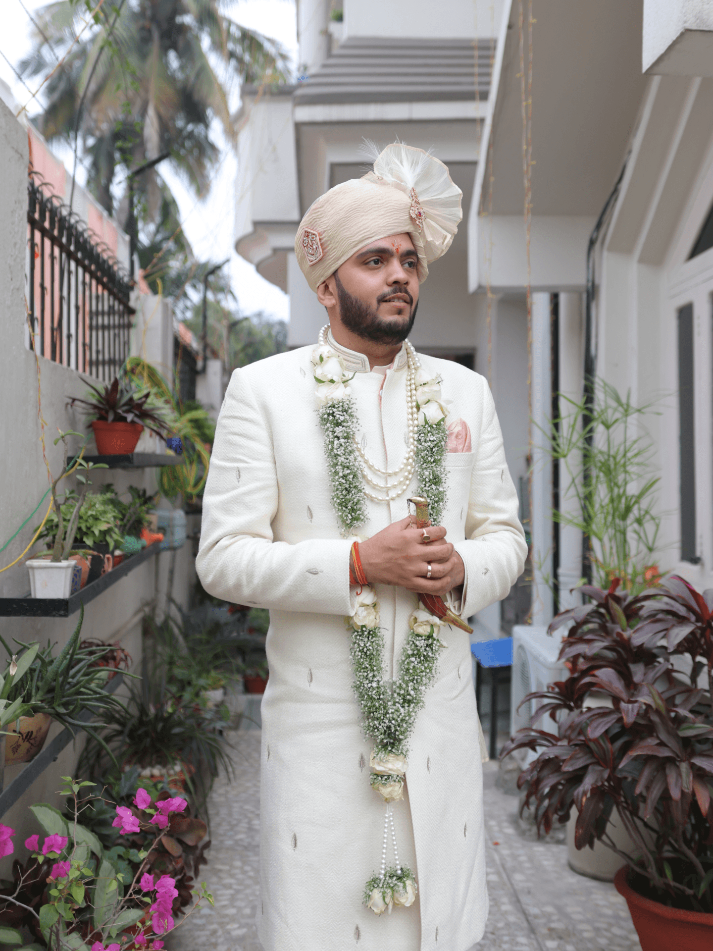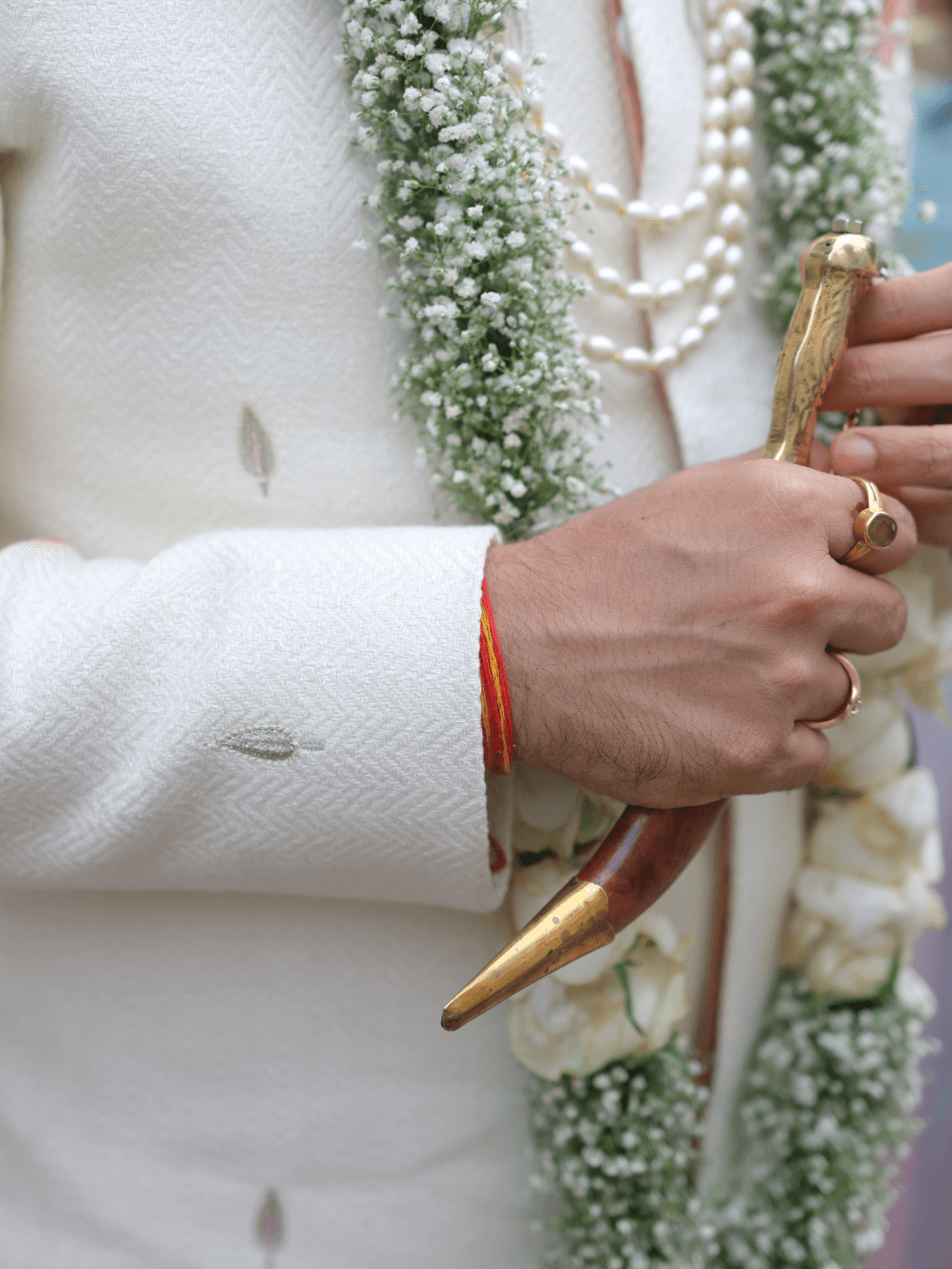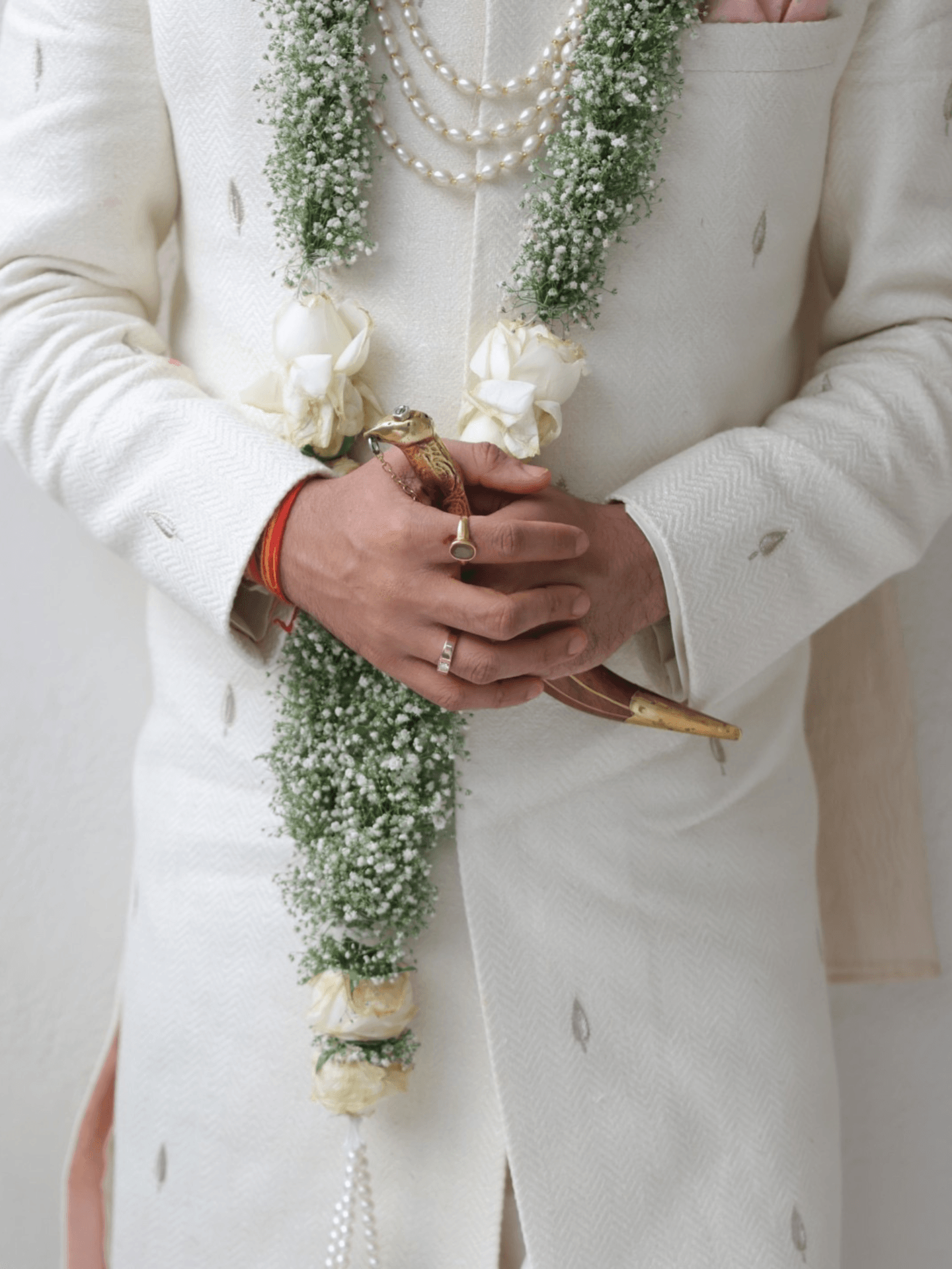 Textured Ivory Sherwani embellished with Hand Embroidered Leaf Motifs & Ornate-collar Embroidery paired with Tonal Kurta, Pants & Mukaish work Chanderi Dupatta.