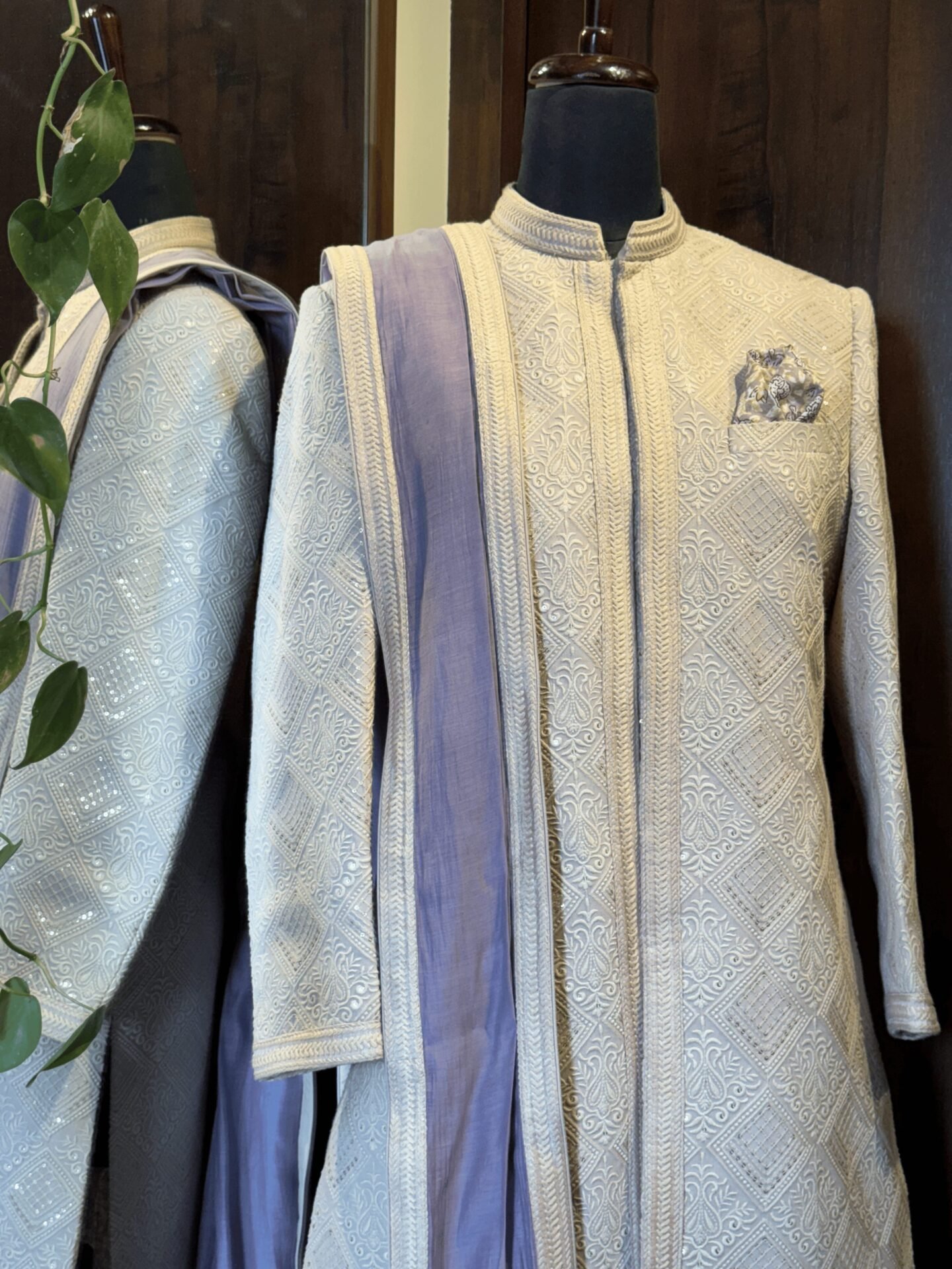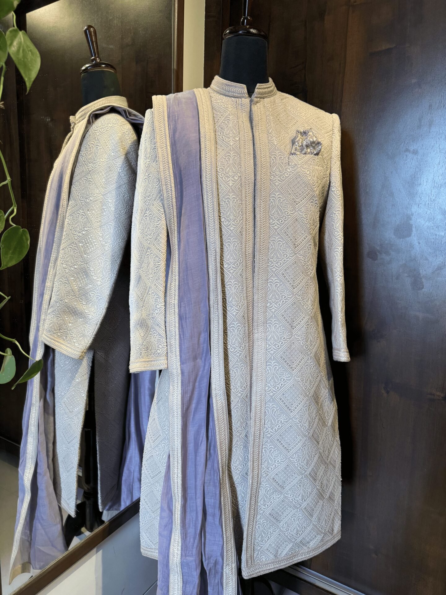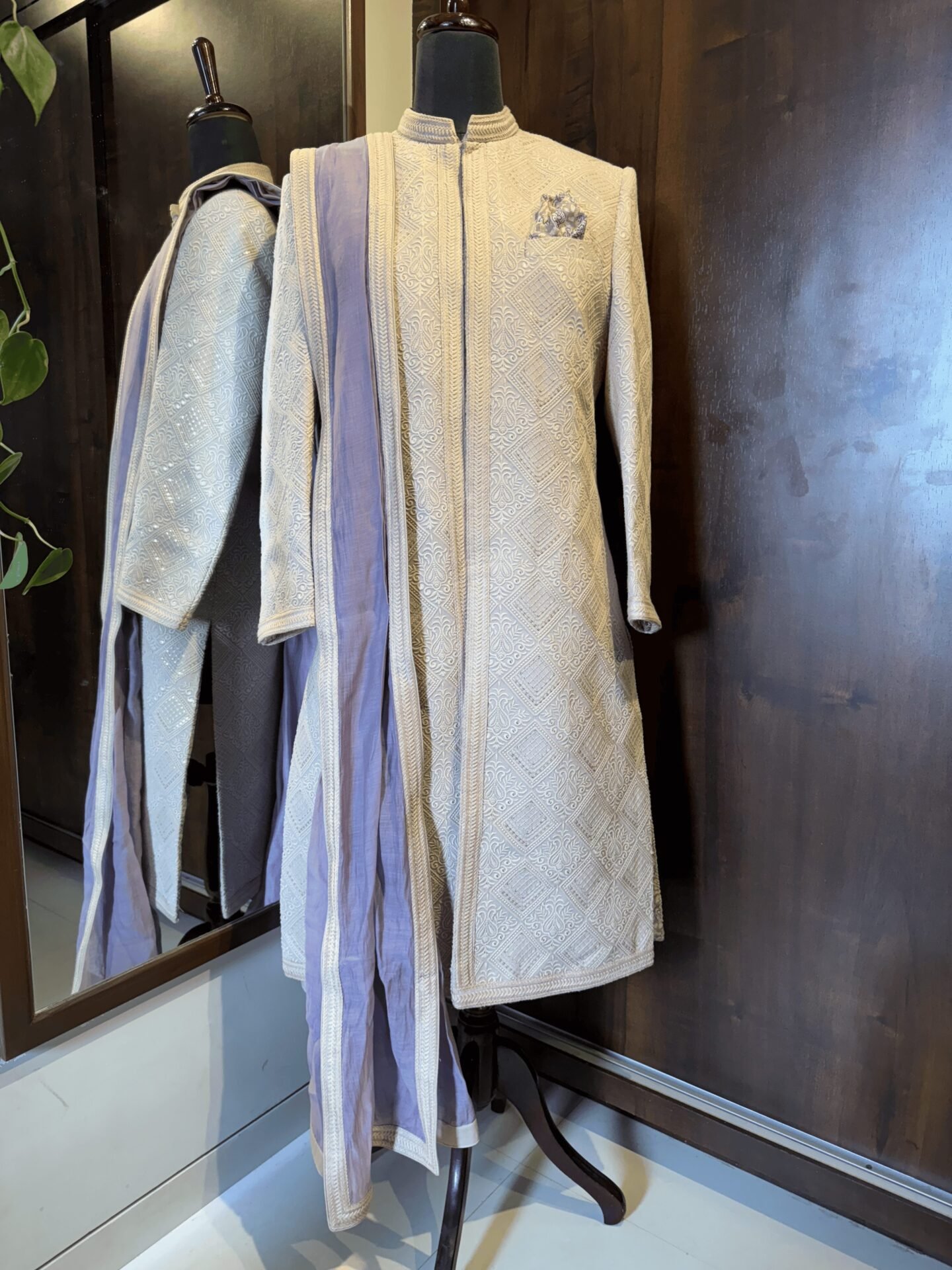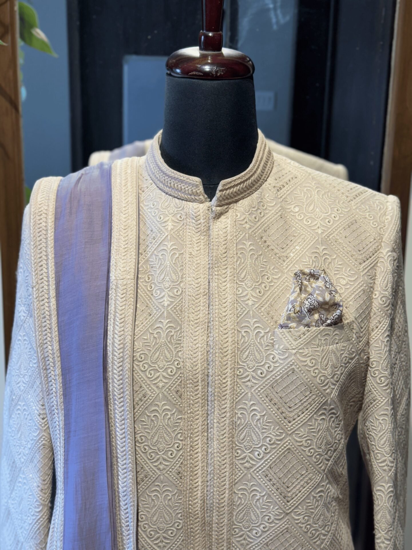 Light Beige Sherwani with all over geometric pattern Chikankari Embroidery. Paired with Tonal Kurta, Pant & Lilac Chanderi Dupatta.