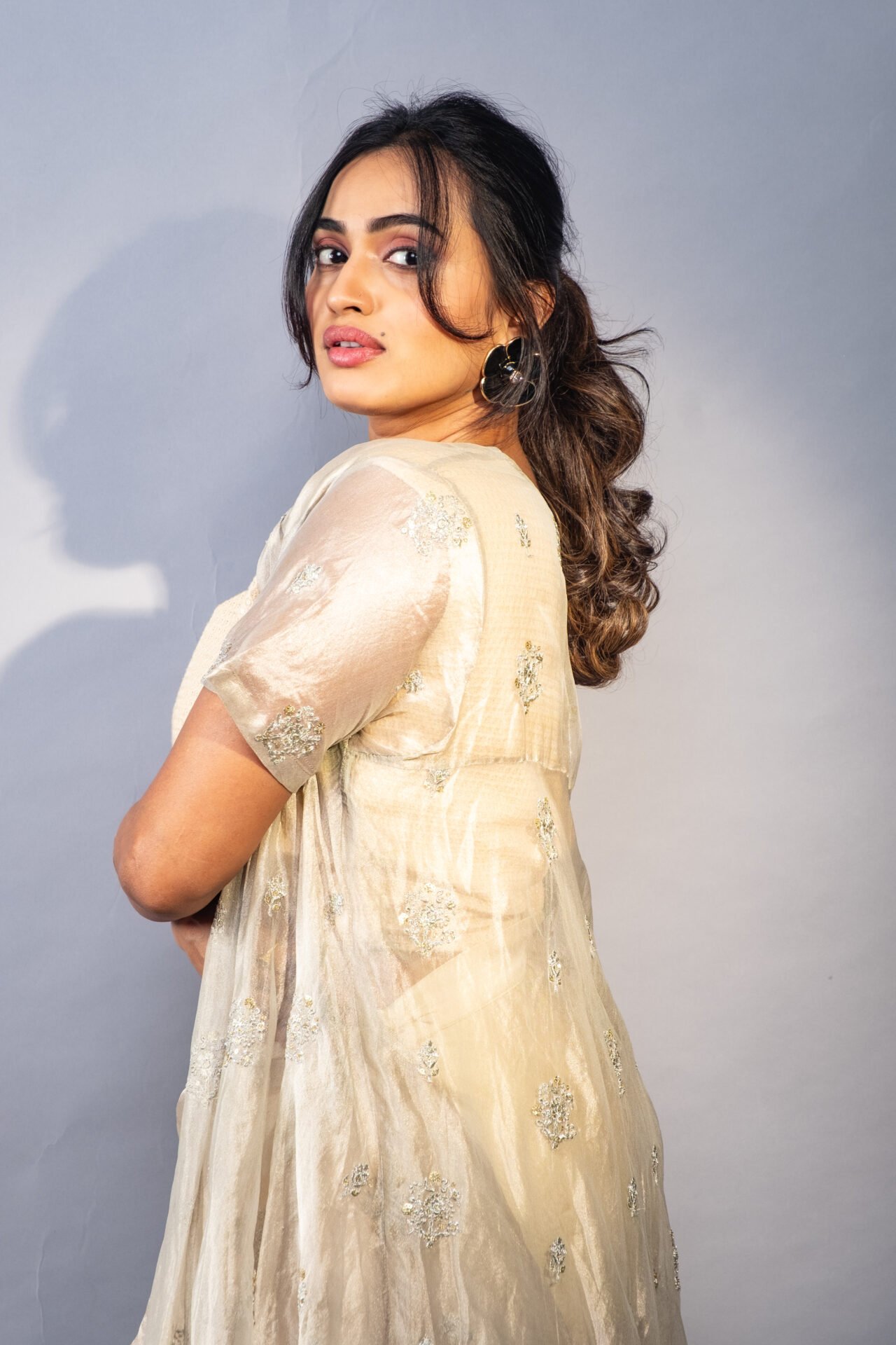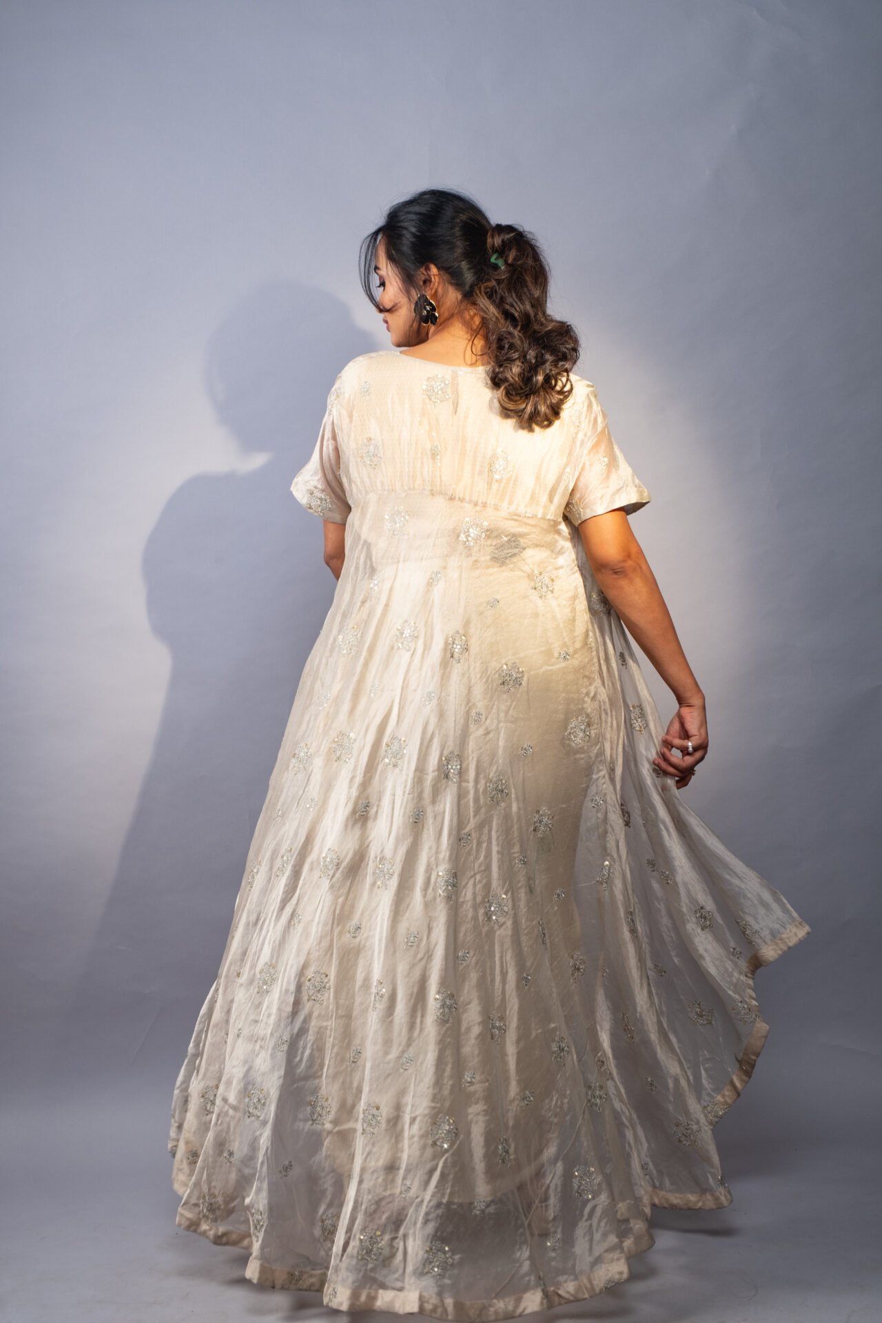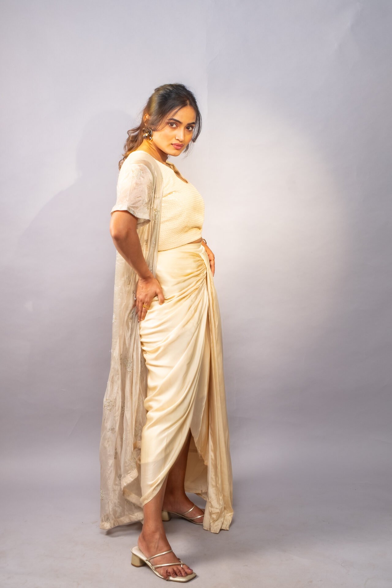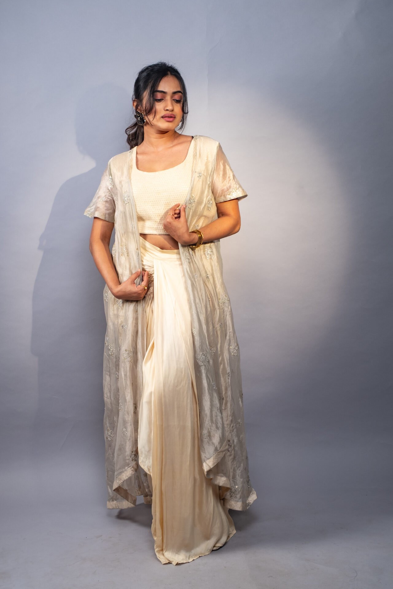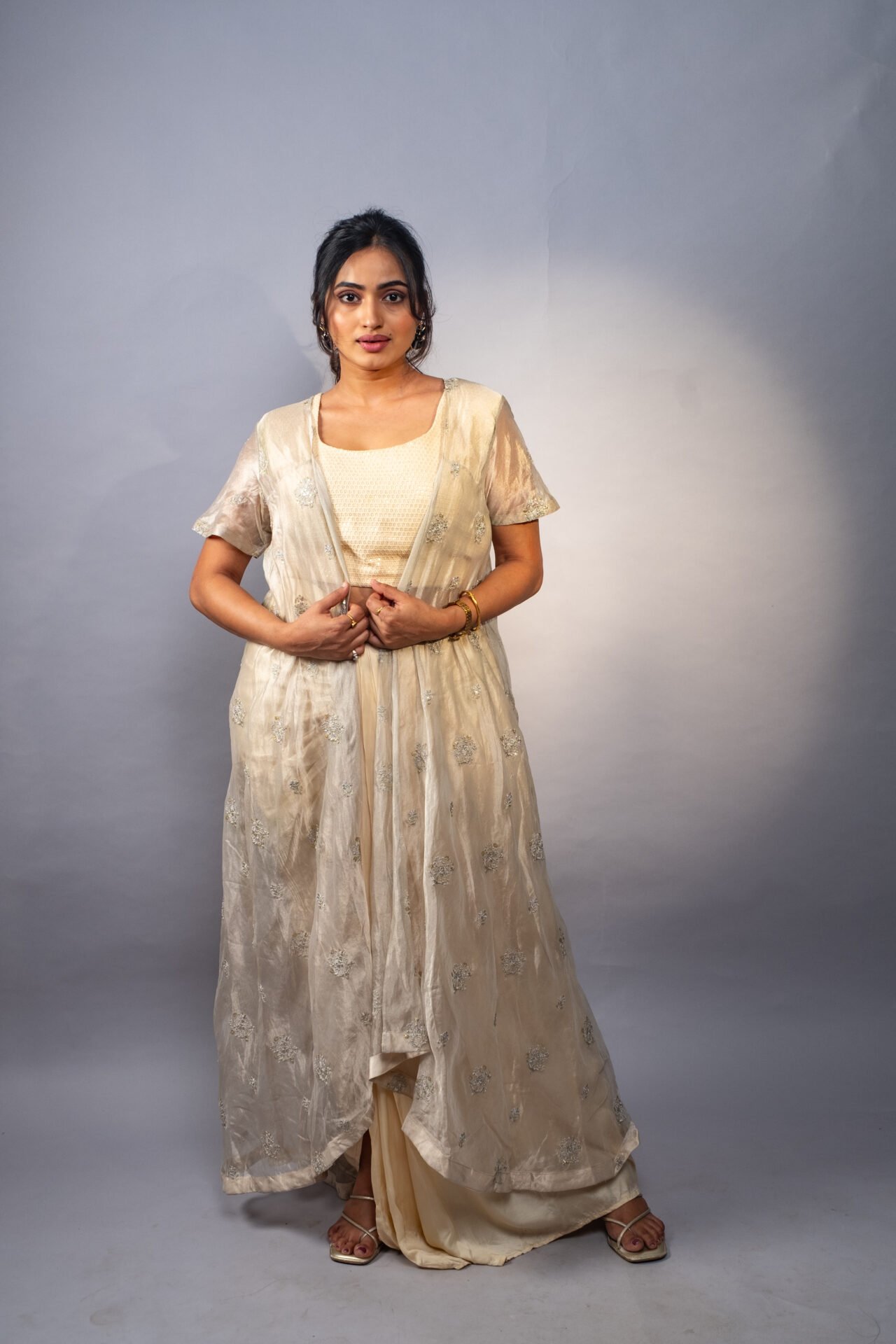 Light Gold Tissue Jacket with Embroidered Butta paired with Matching Textured Blouse and Draped Skirt. A captivating blend of Sophistication and Allure. Crafted from High End Fabric, this set is designed to make a statement at any occasion.
