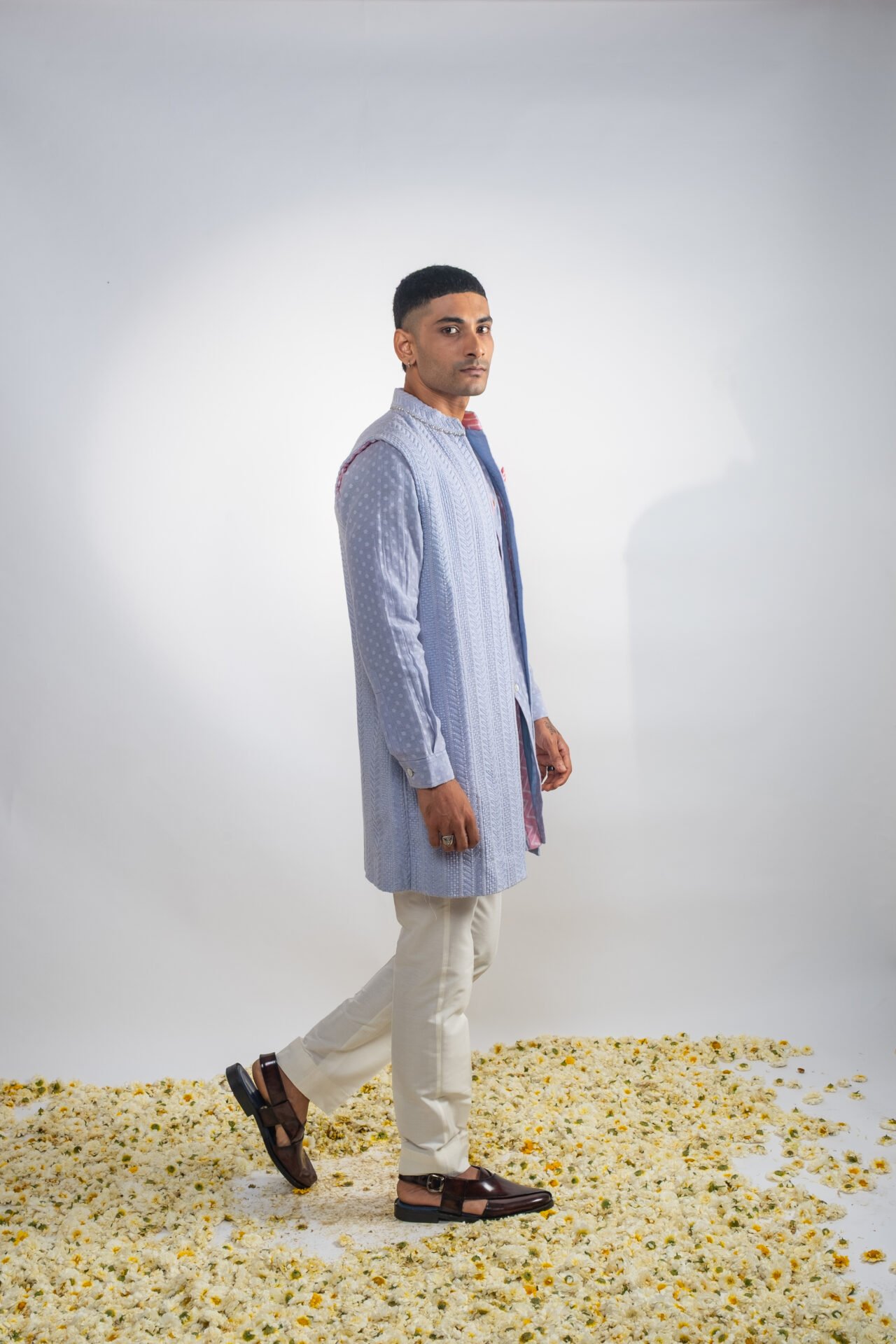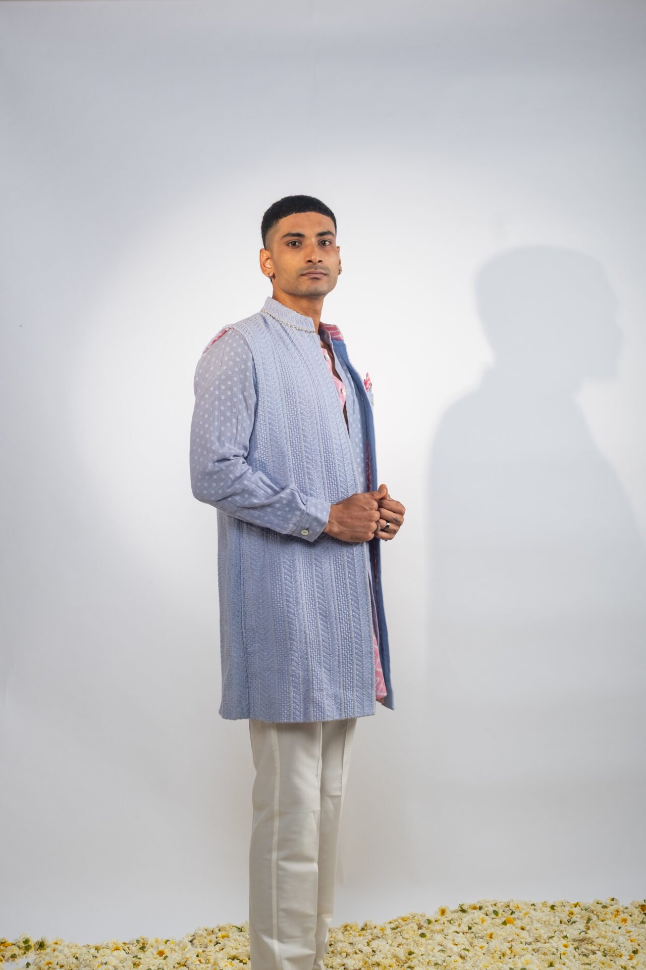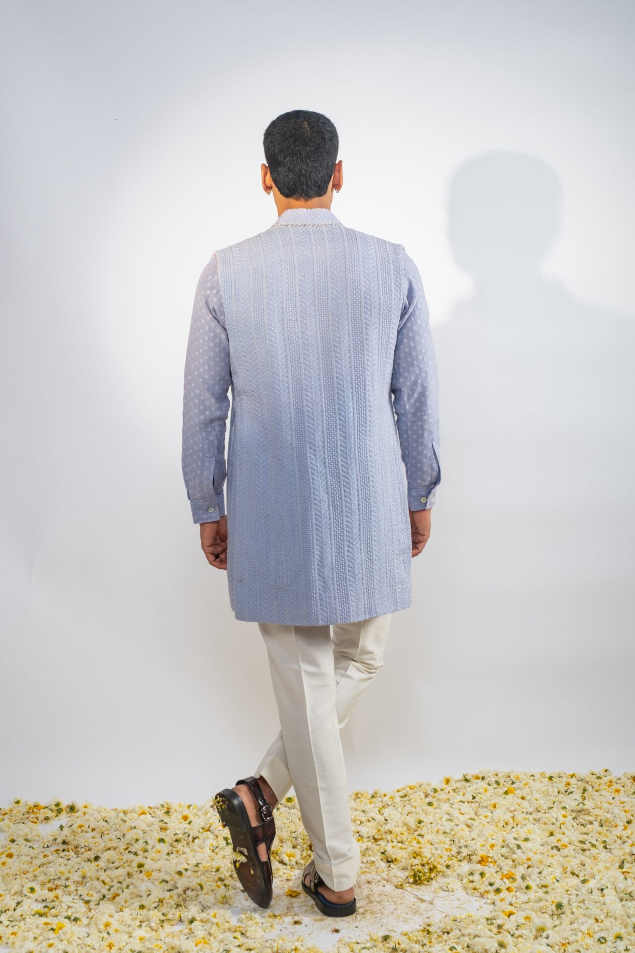 Foliage Vine Embroidered Long Bundi Jacket paired with Textured Tonal Kurta and Off White Pants.