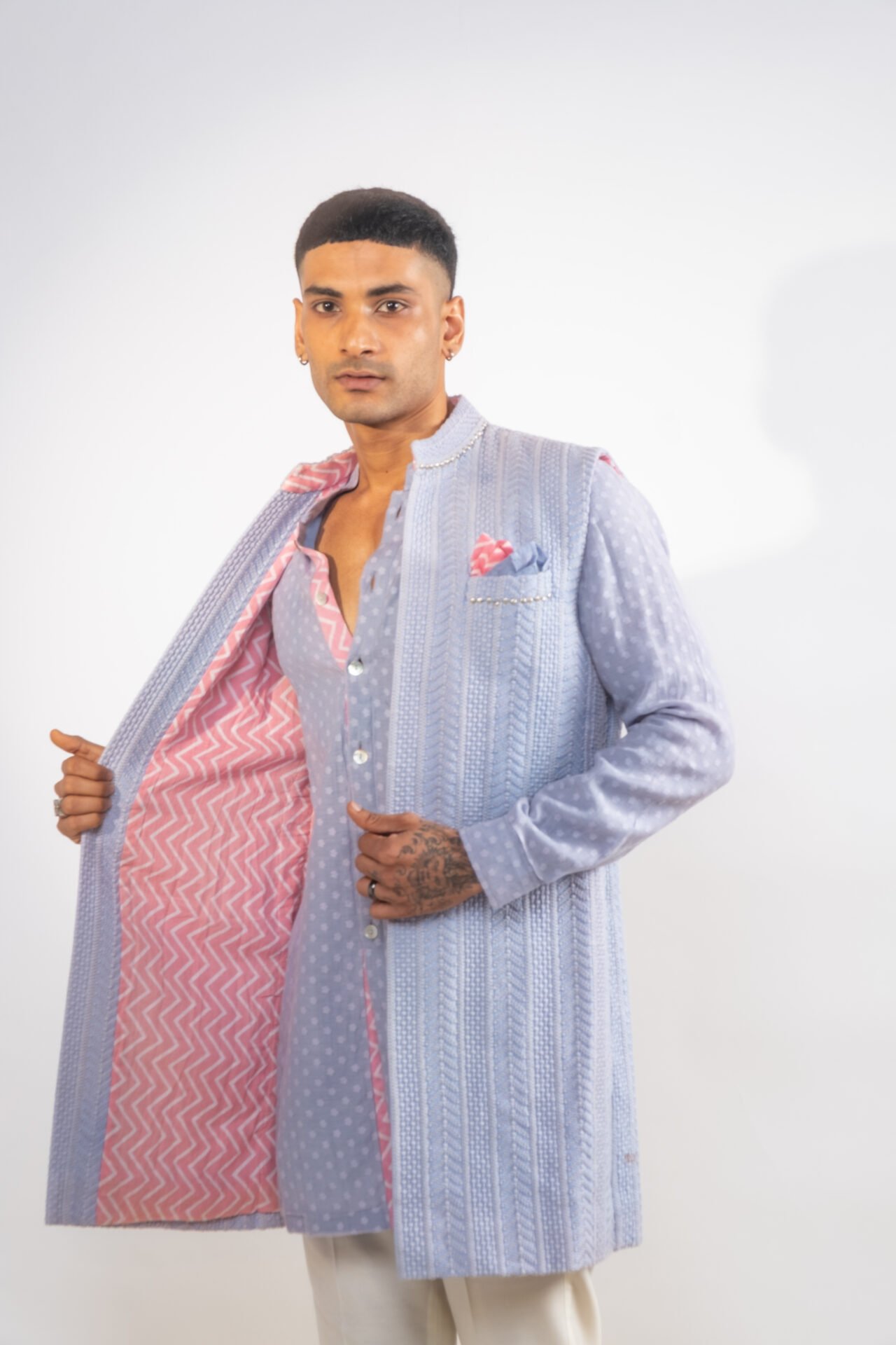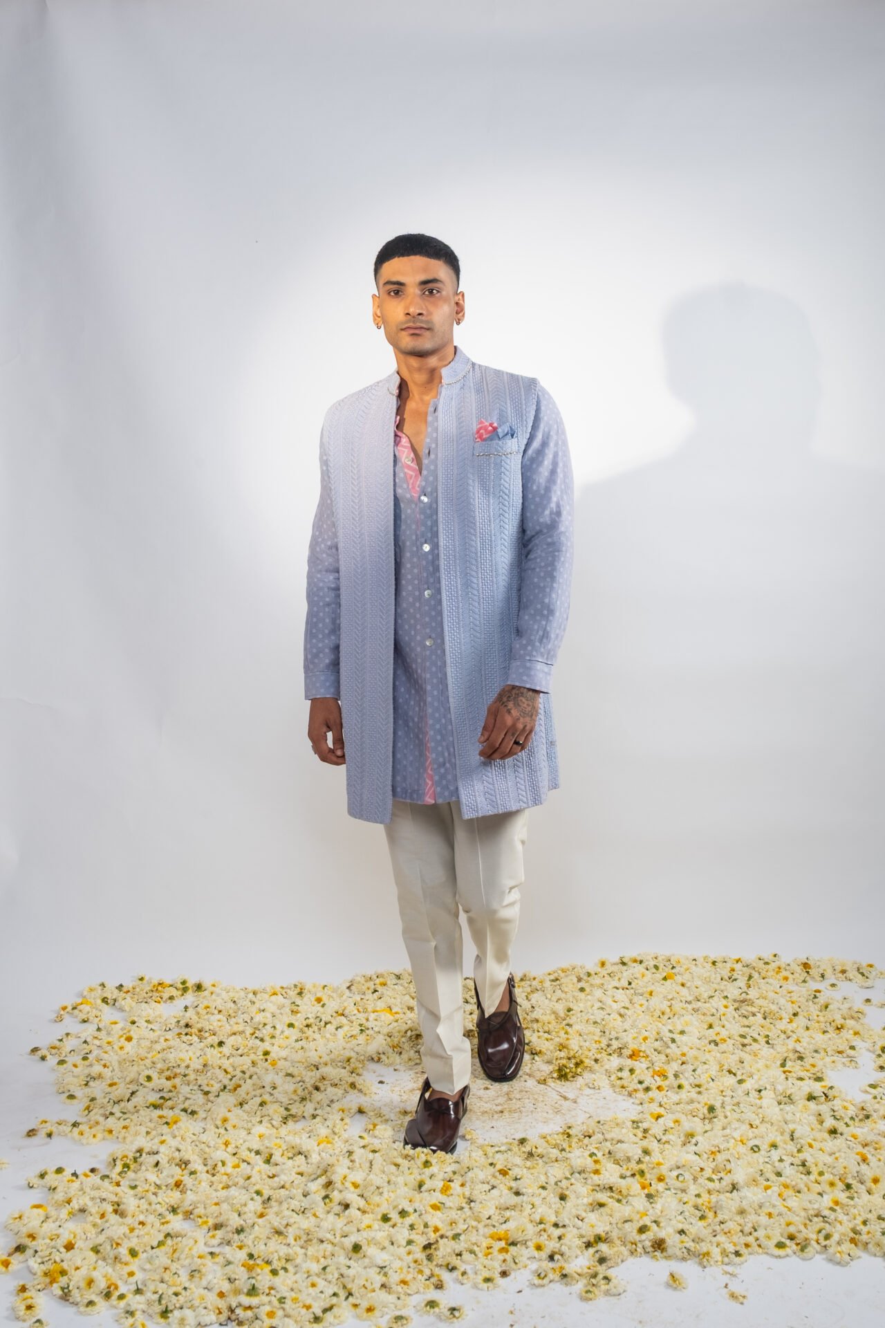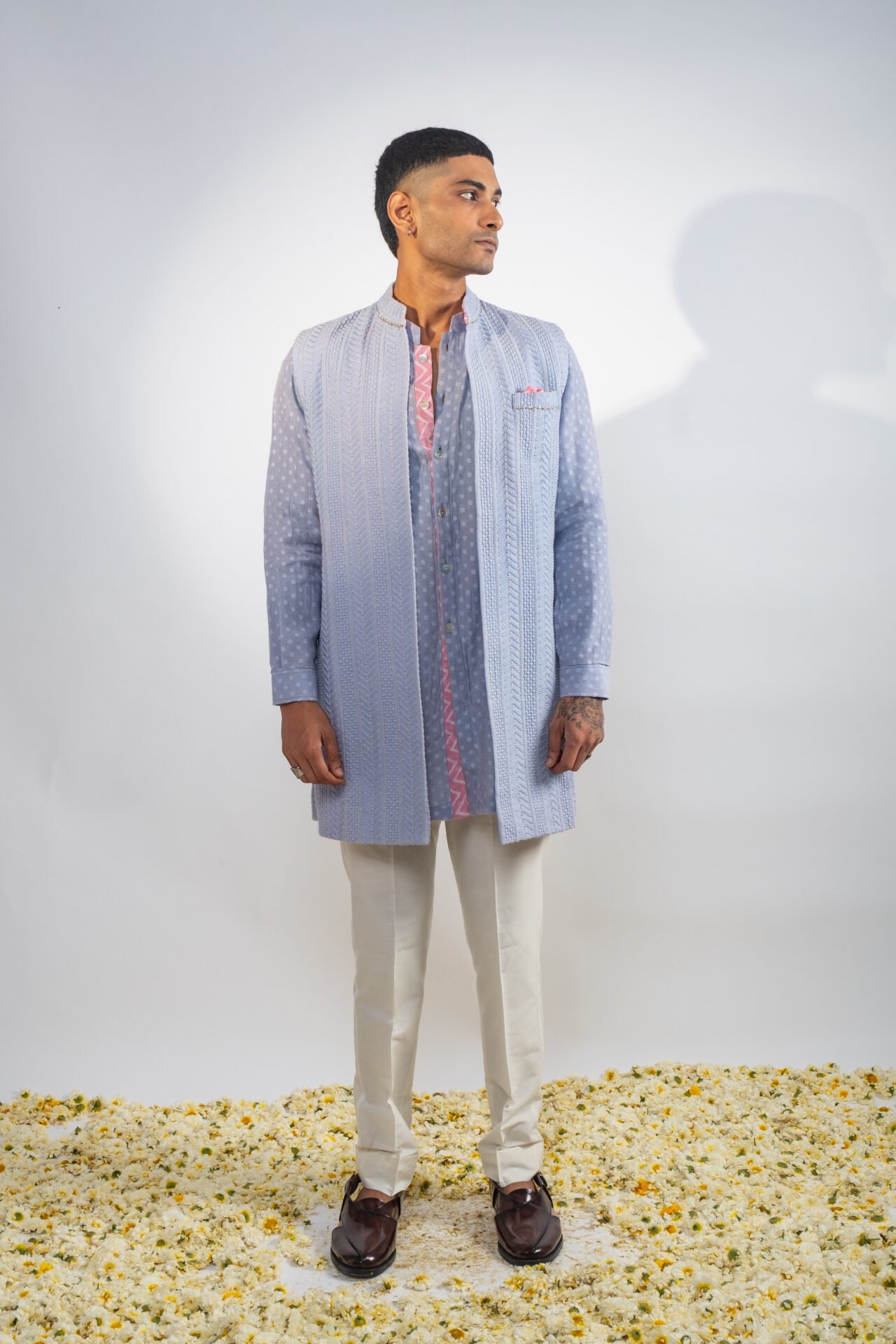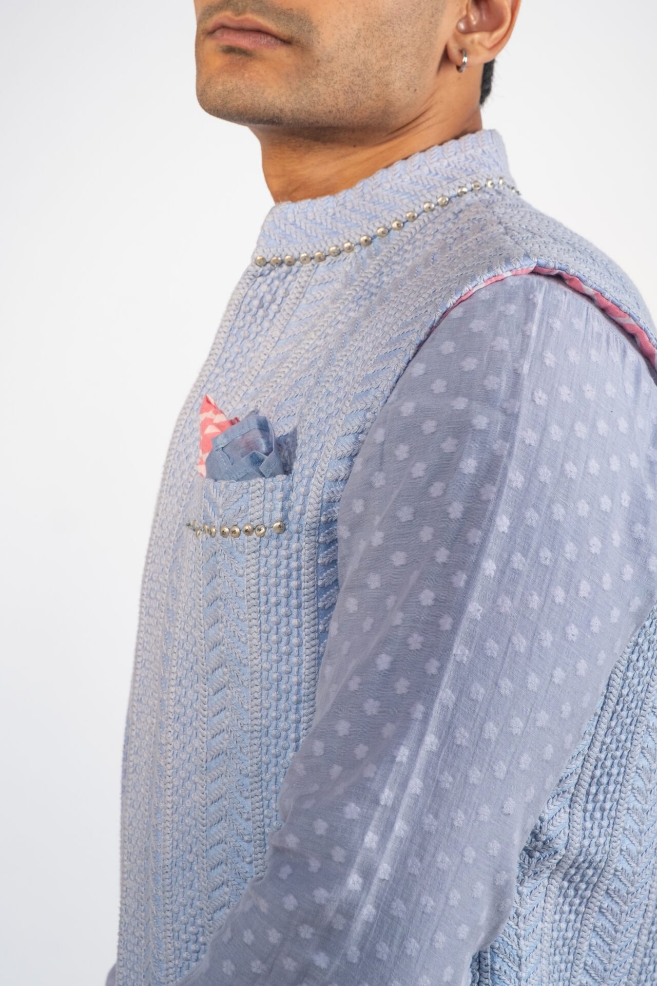 Foliage Vine Embroidered Long Bundi Jacket paired with Textured Tonal Kurta and Off White Pants.