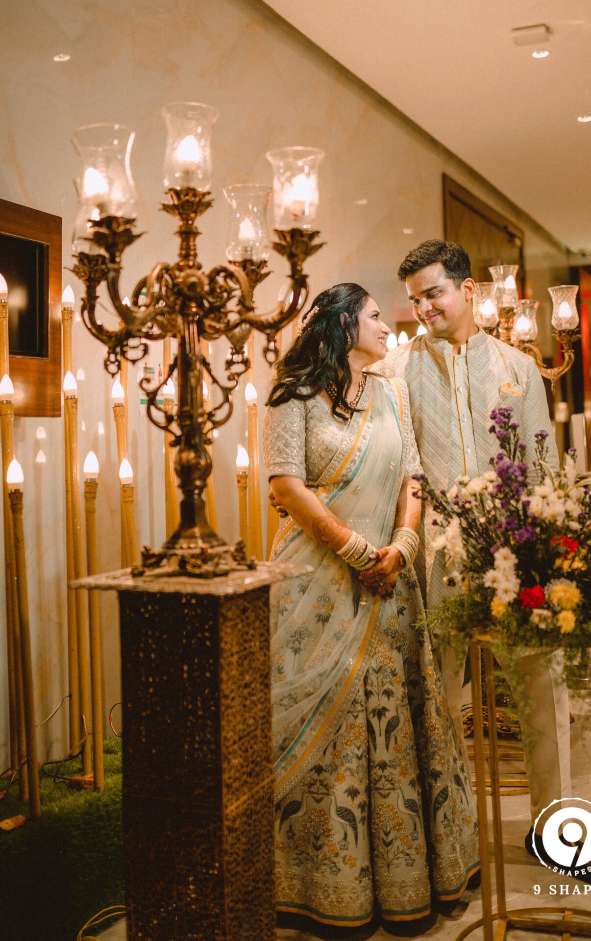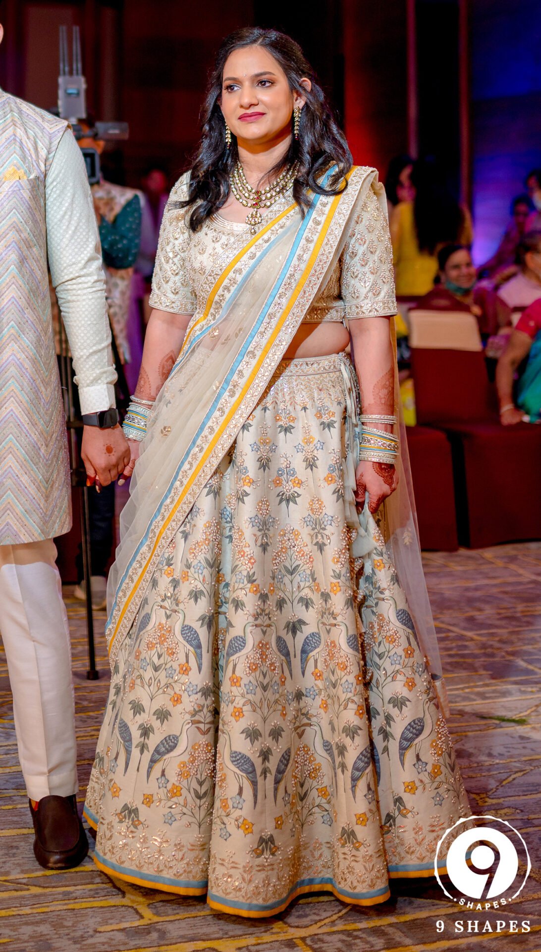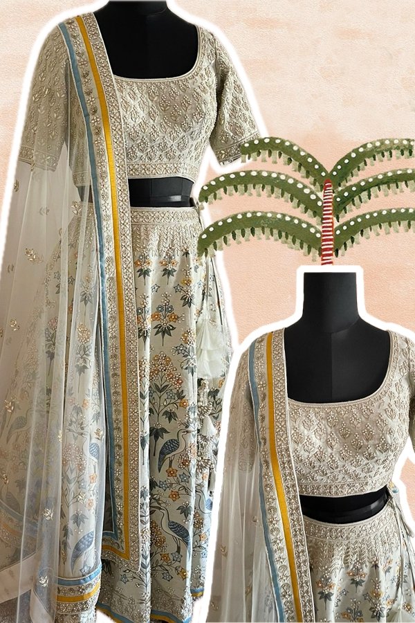 Mint Hand Painted Lehenga with hand work detailing paired with matching blouse & dupatta. A captivating blend of sophistication and allure. Crafted from raw silk fabric, this set is designed to make a statement at any occasion.