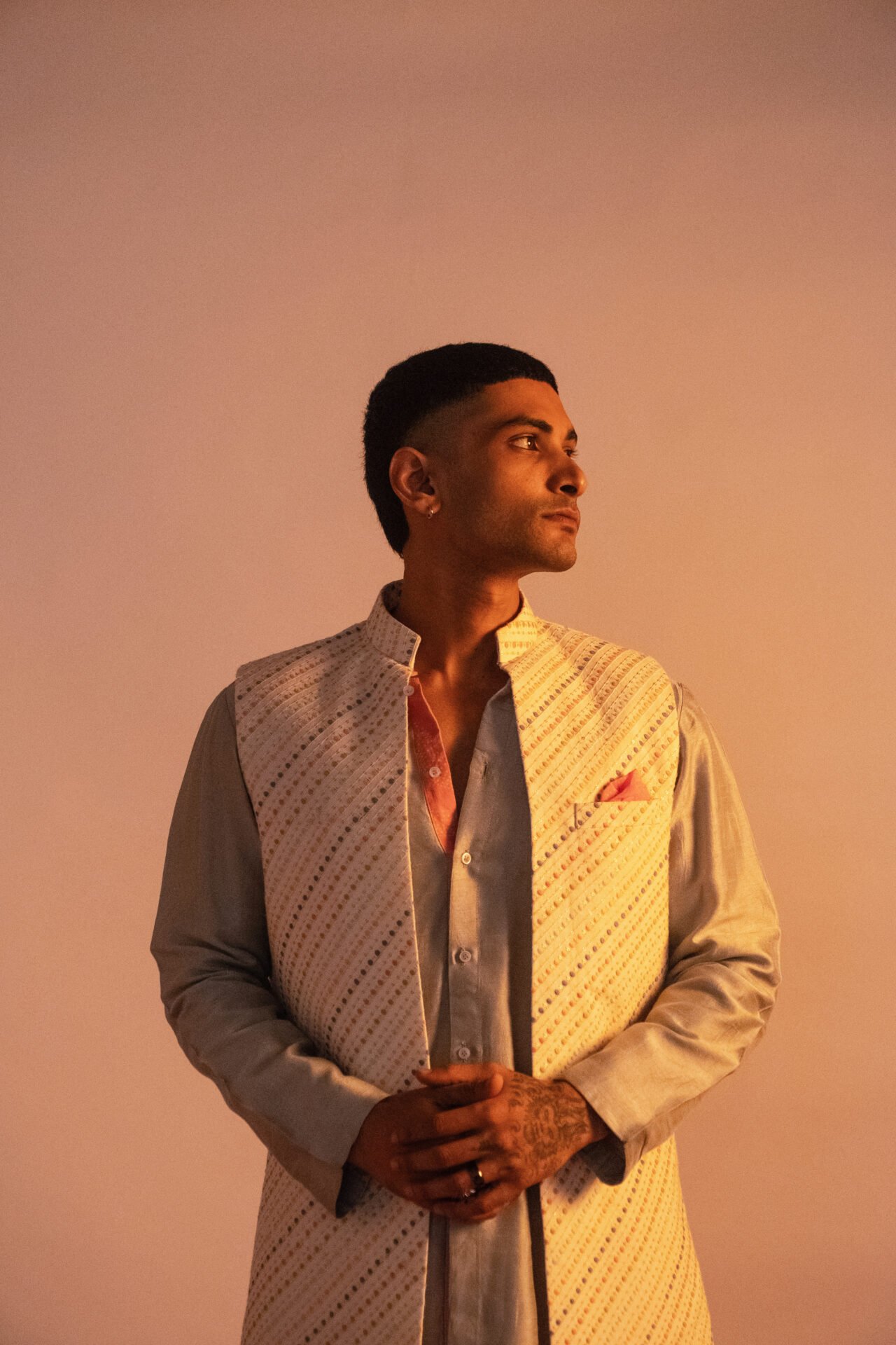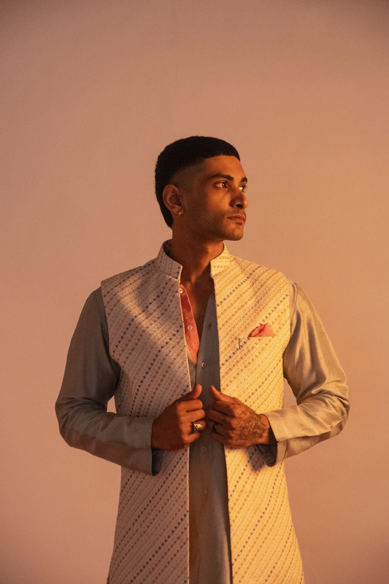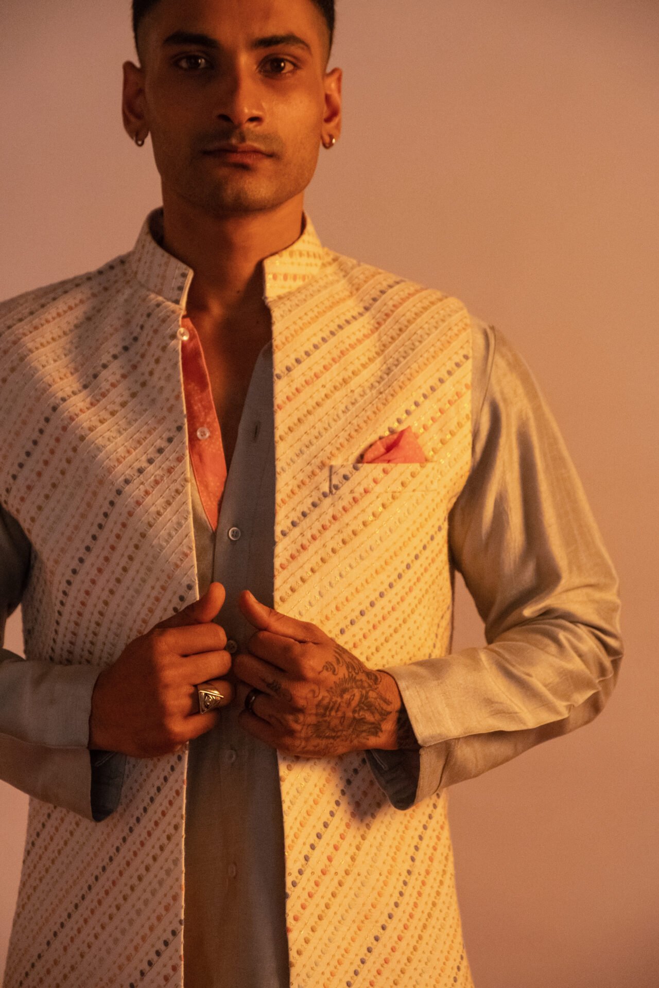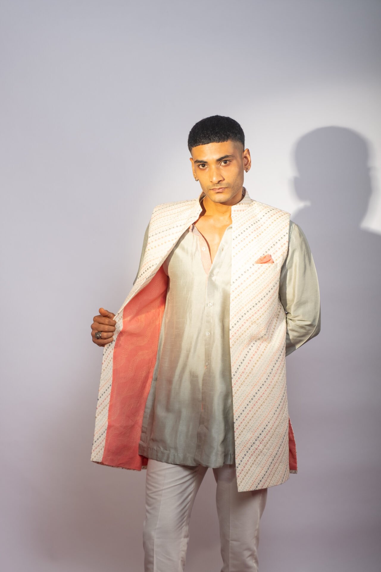 Multicolour Stripe Embroidered Long Bundi Jacket paired with contrast Front Open Kurta and Off White Pant.