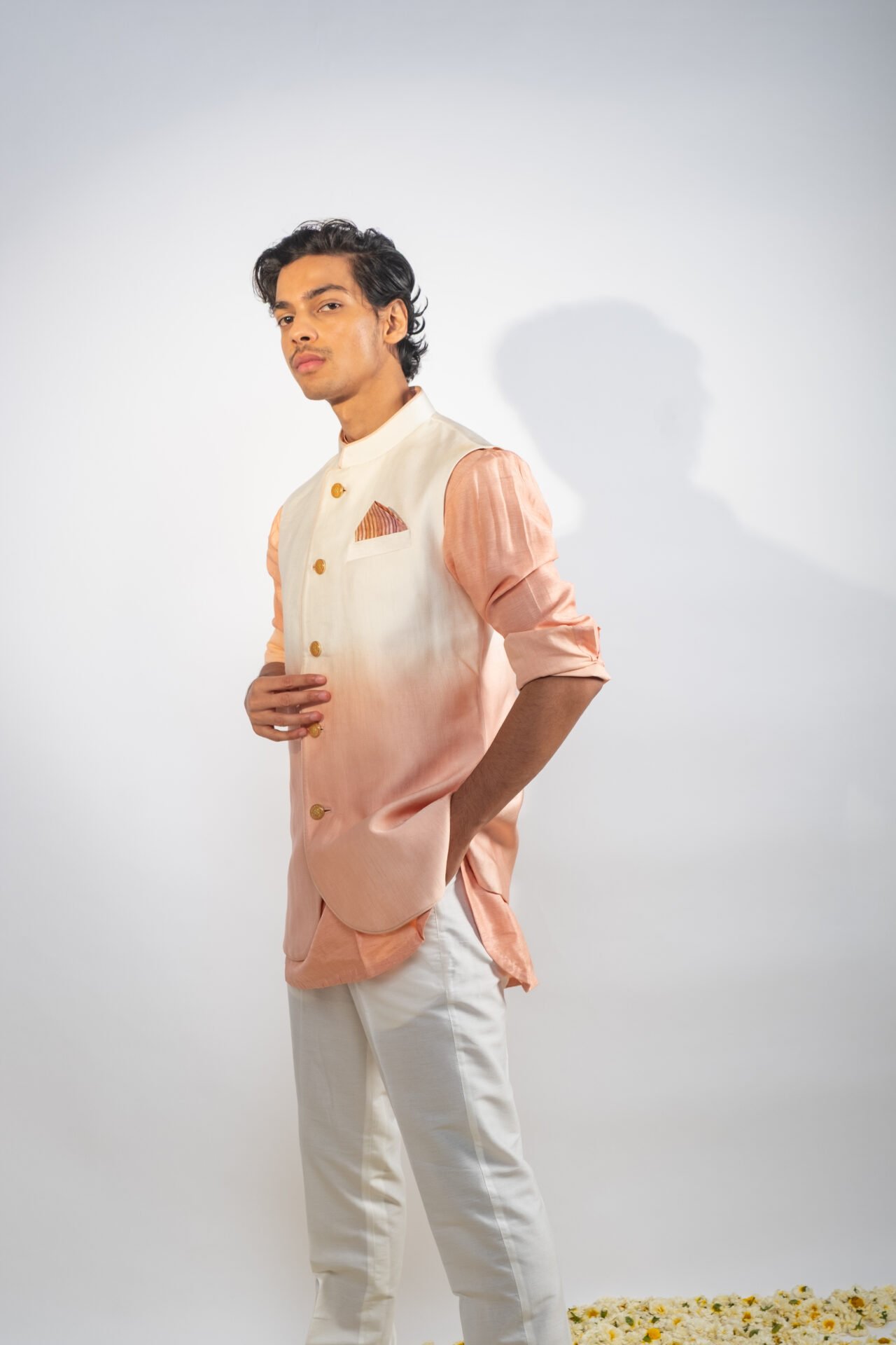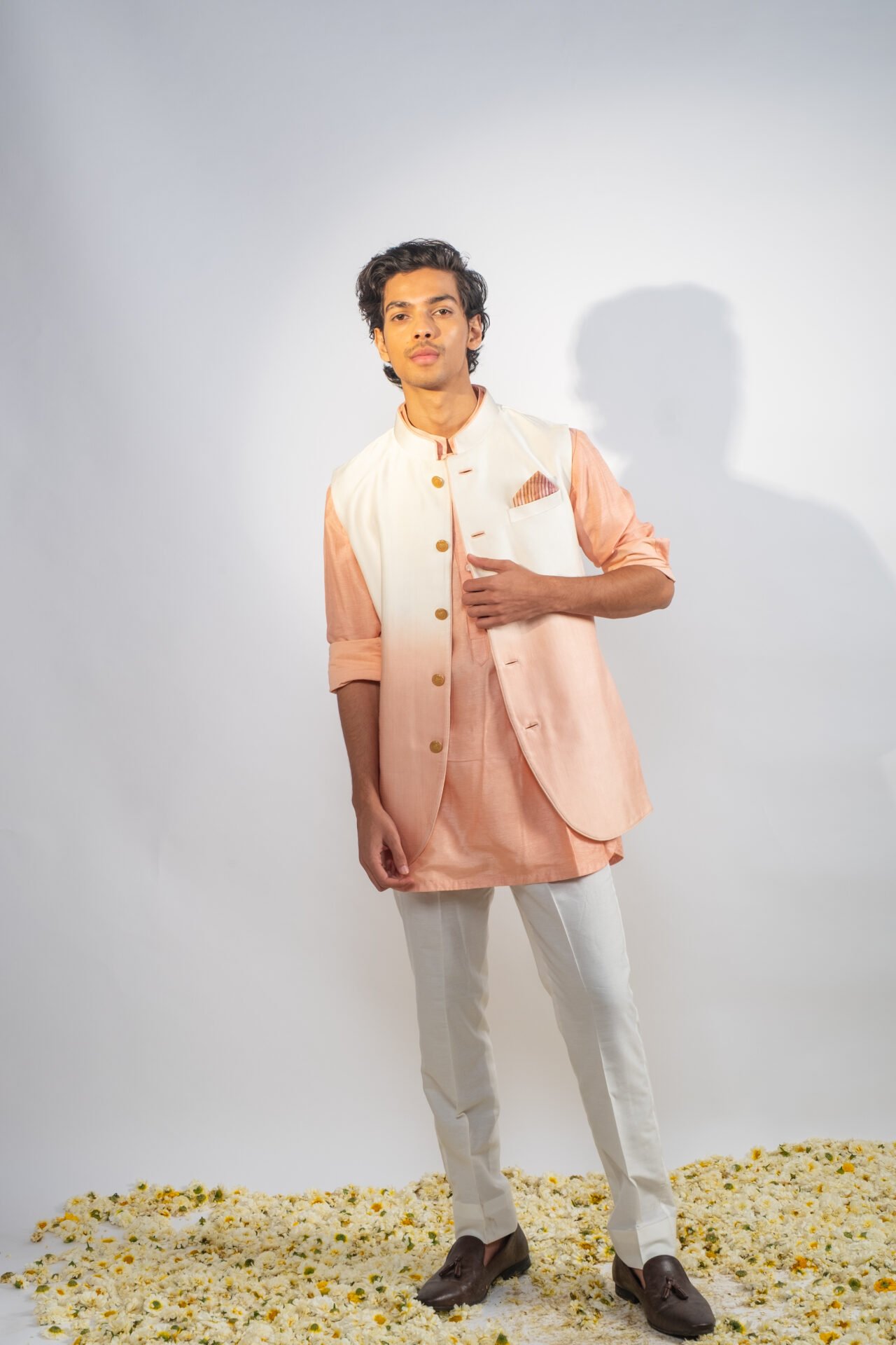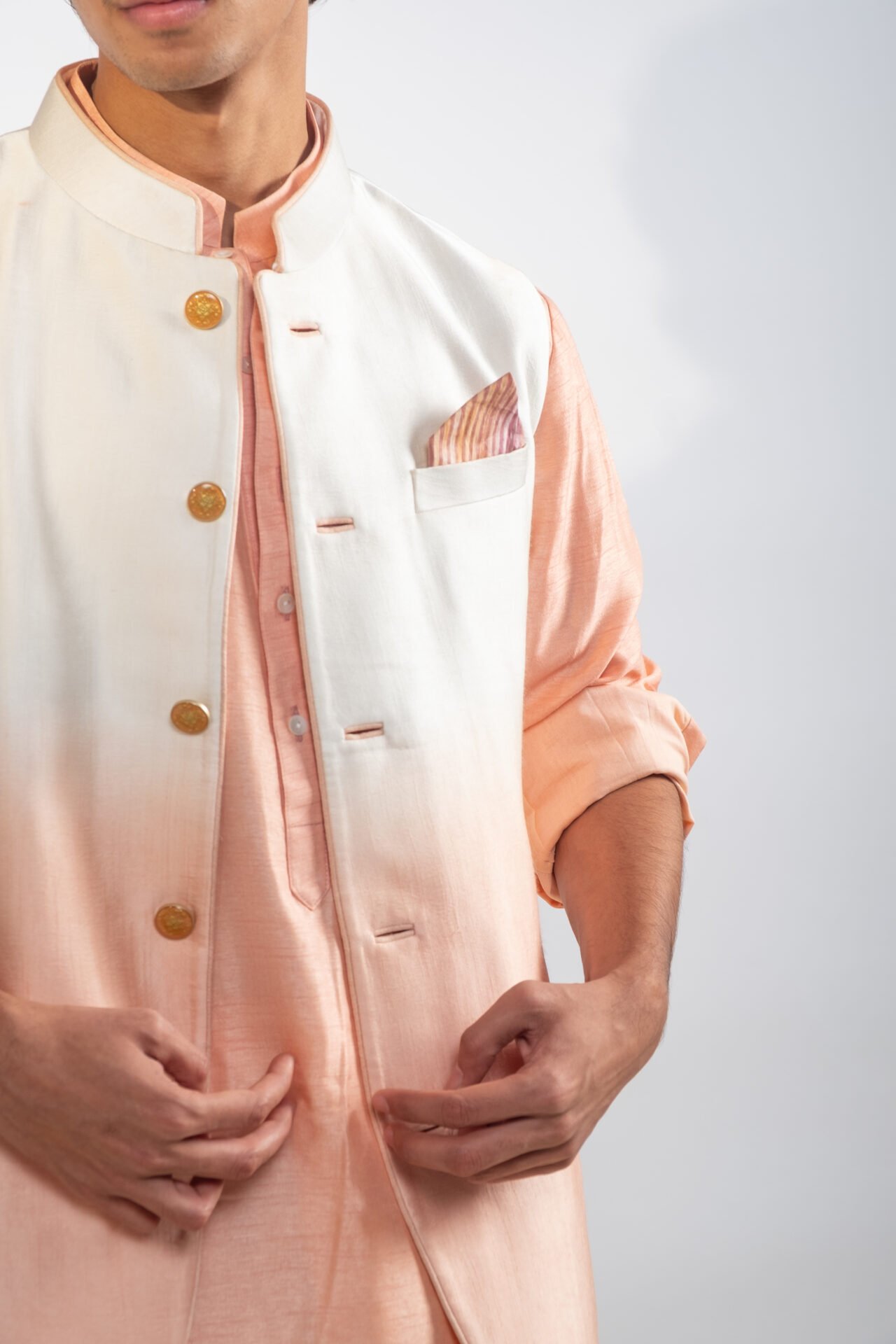 Peach Ombre Bundi Jacket paired with Peach Kurta and Off White Pant.