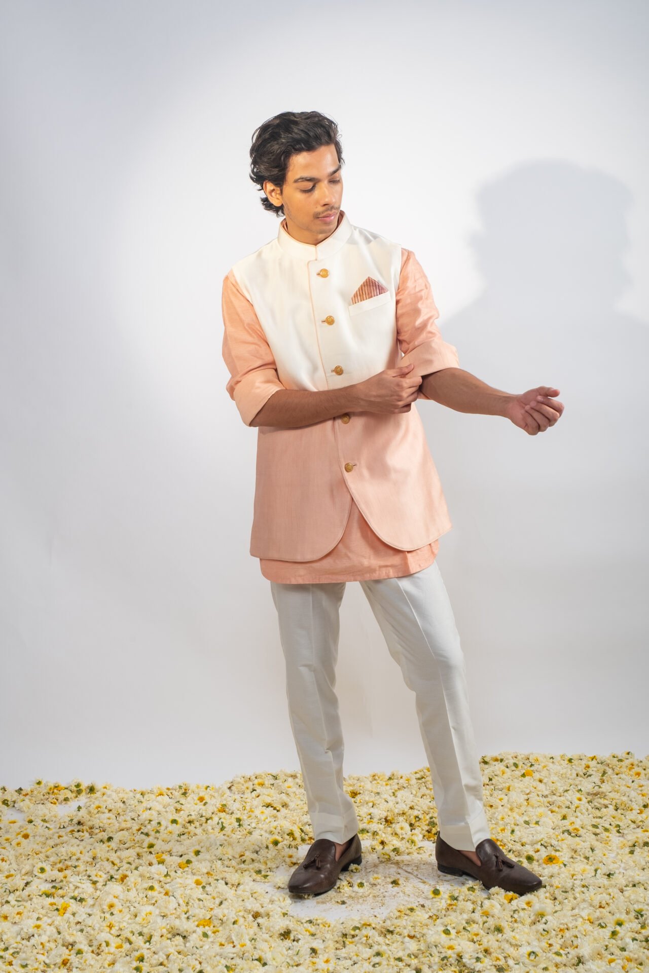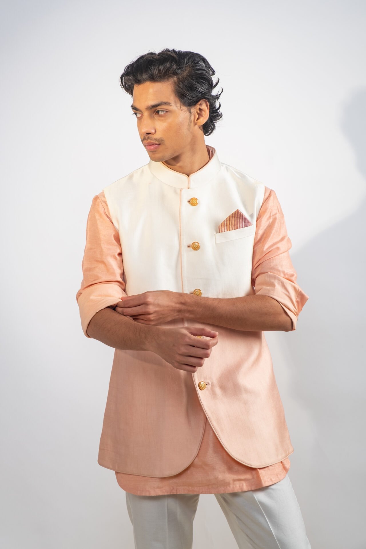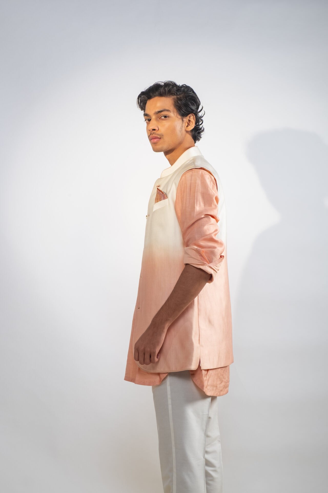 Peach Ombre Bundi Jacket paired with Peach Kurta and Off White Pant.