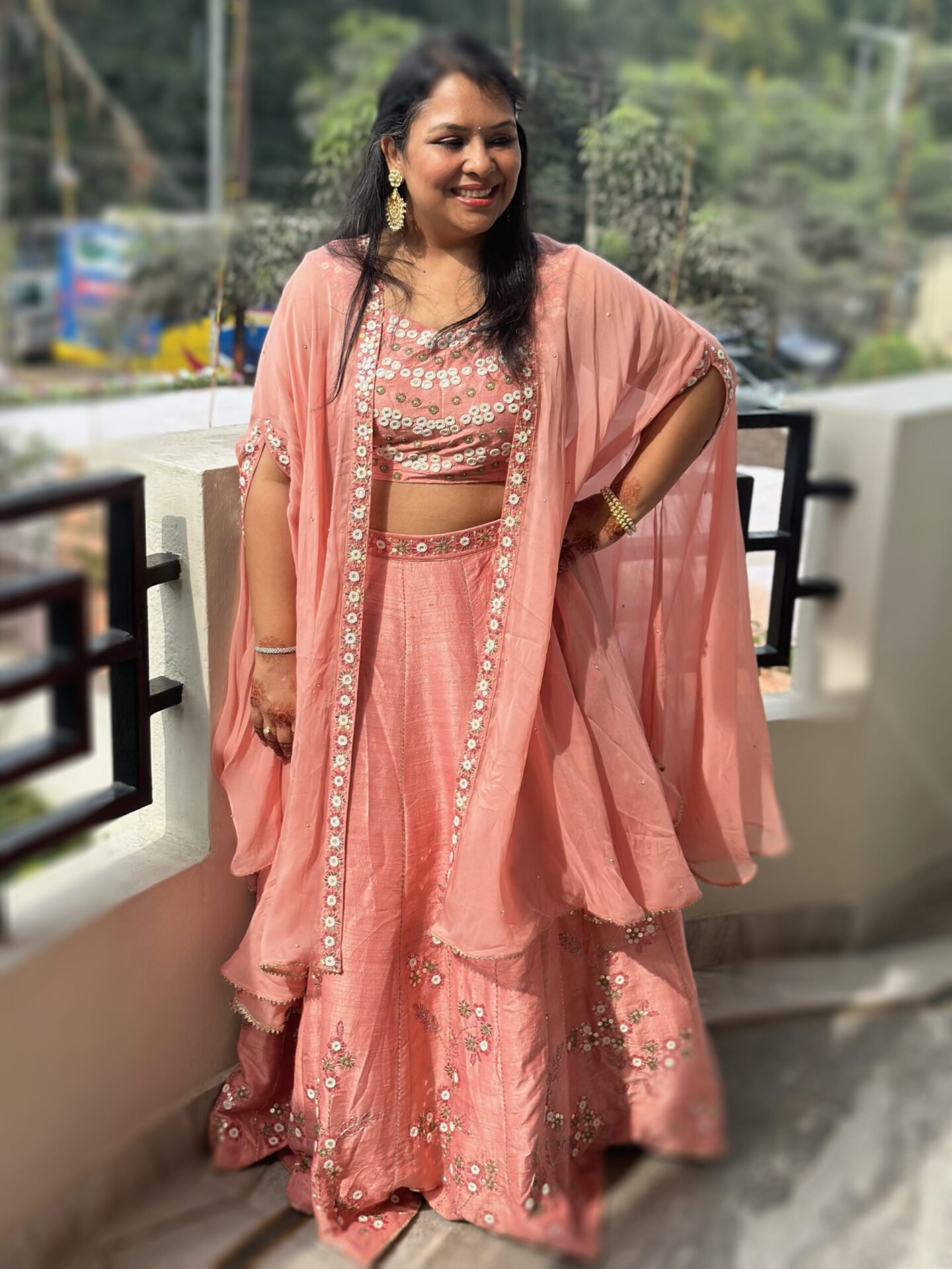 Peach Hand Embroidered Lehenga paired with matching cape and blouse. Crafted from georgette organza and raw silk fabric, this set is designed to make a statement at any occasion.