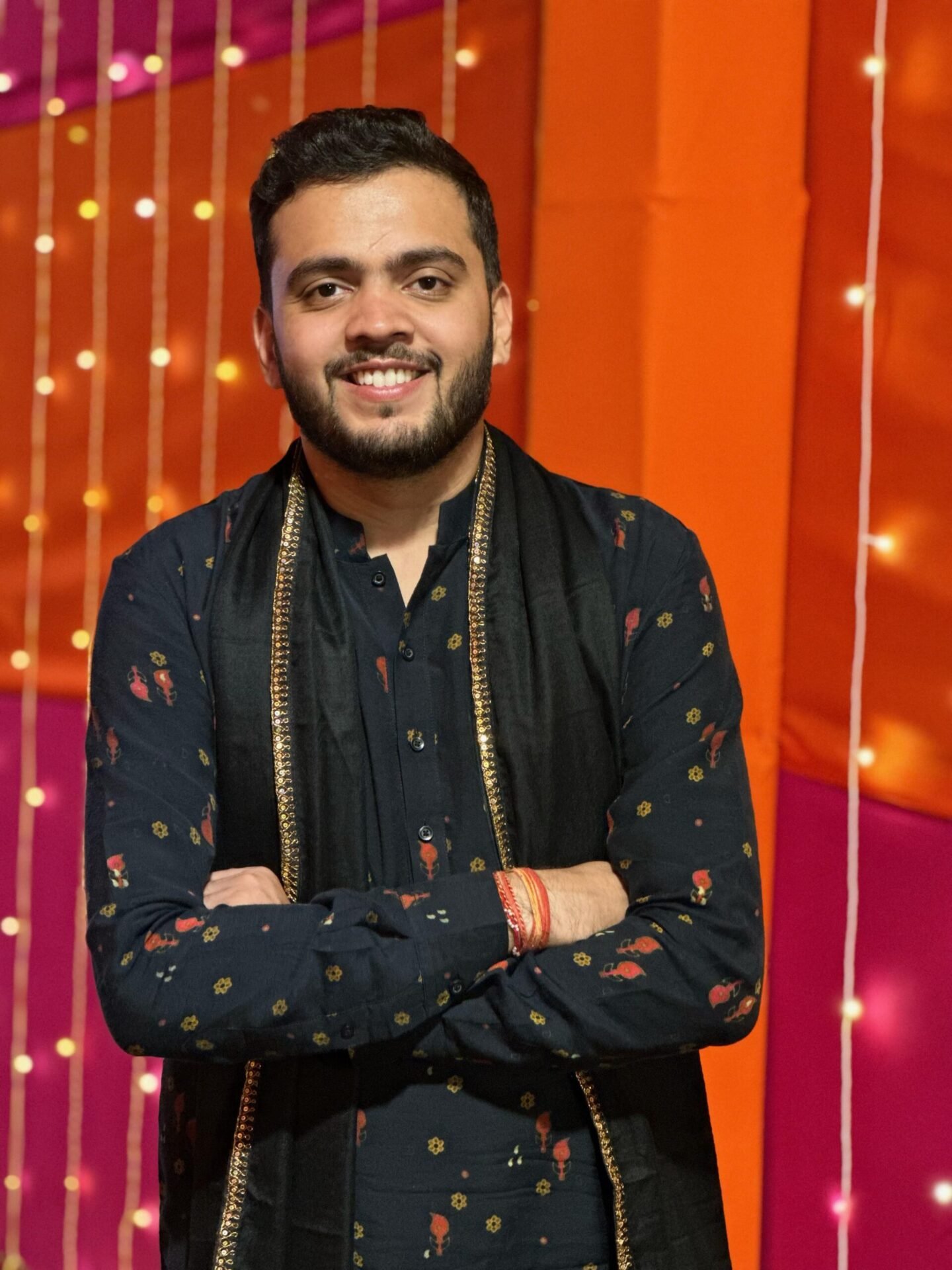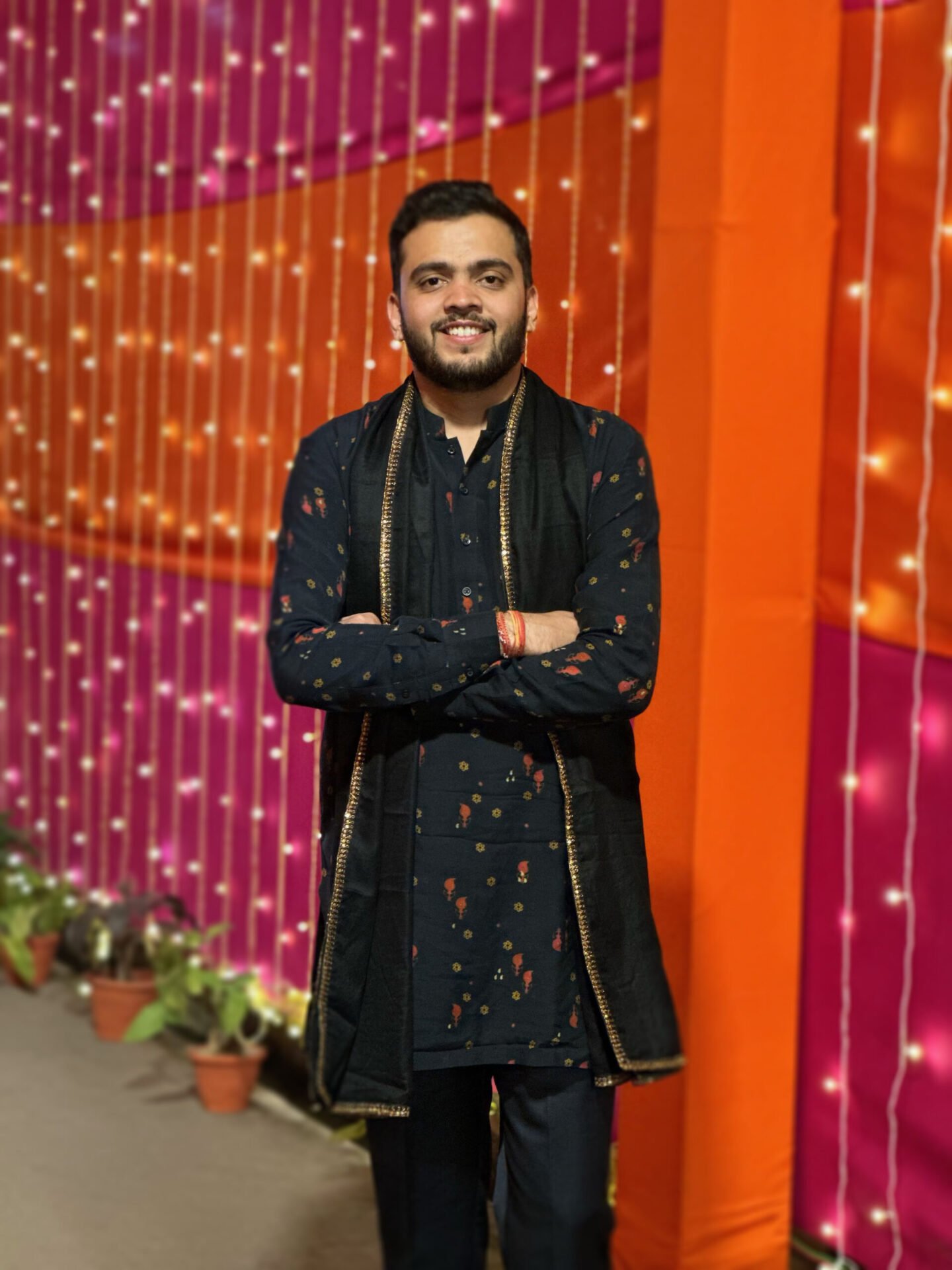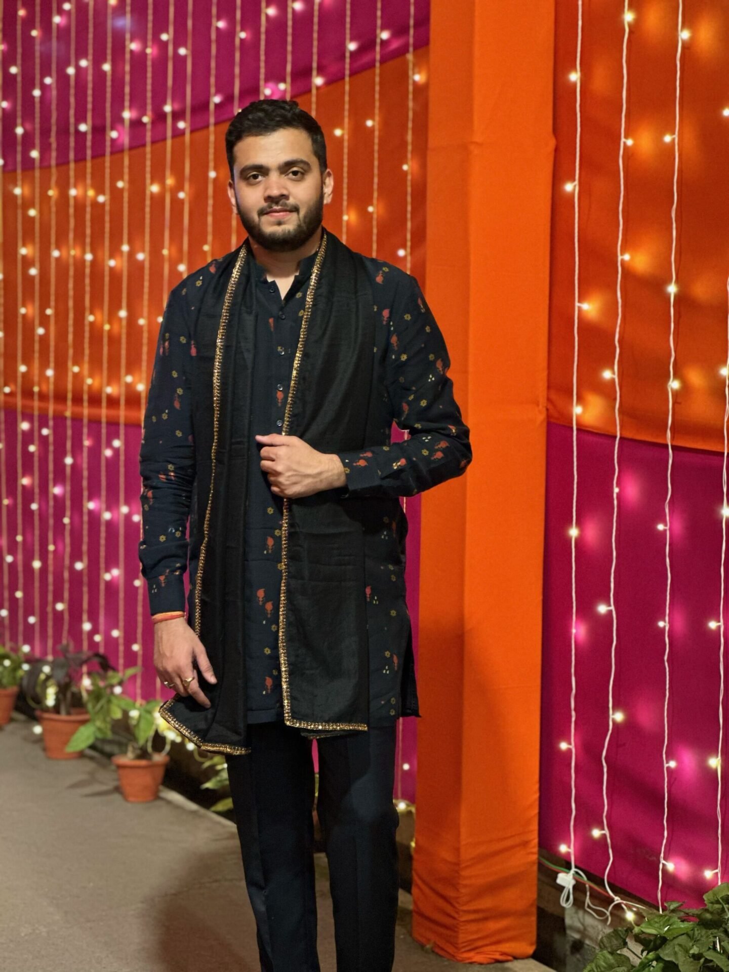 Black Kurta Set with Small Floral Motifs all over. Paired with Black Pants.