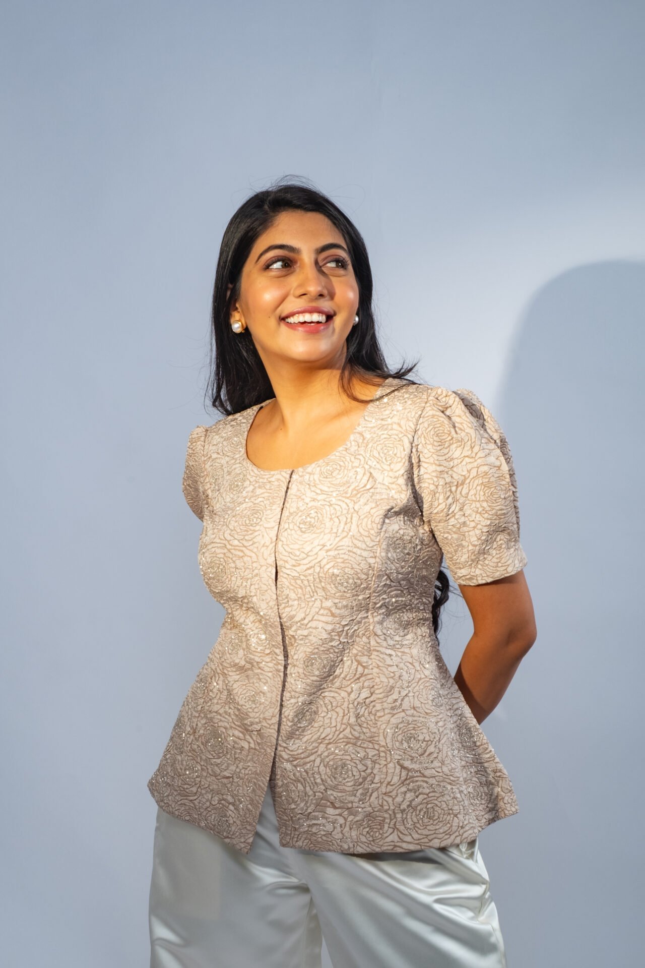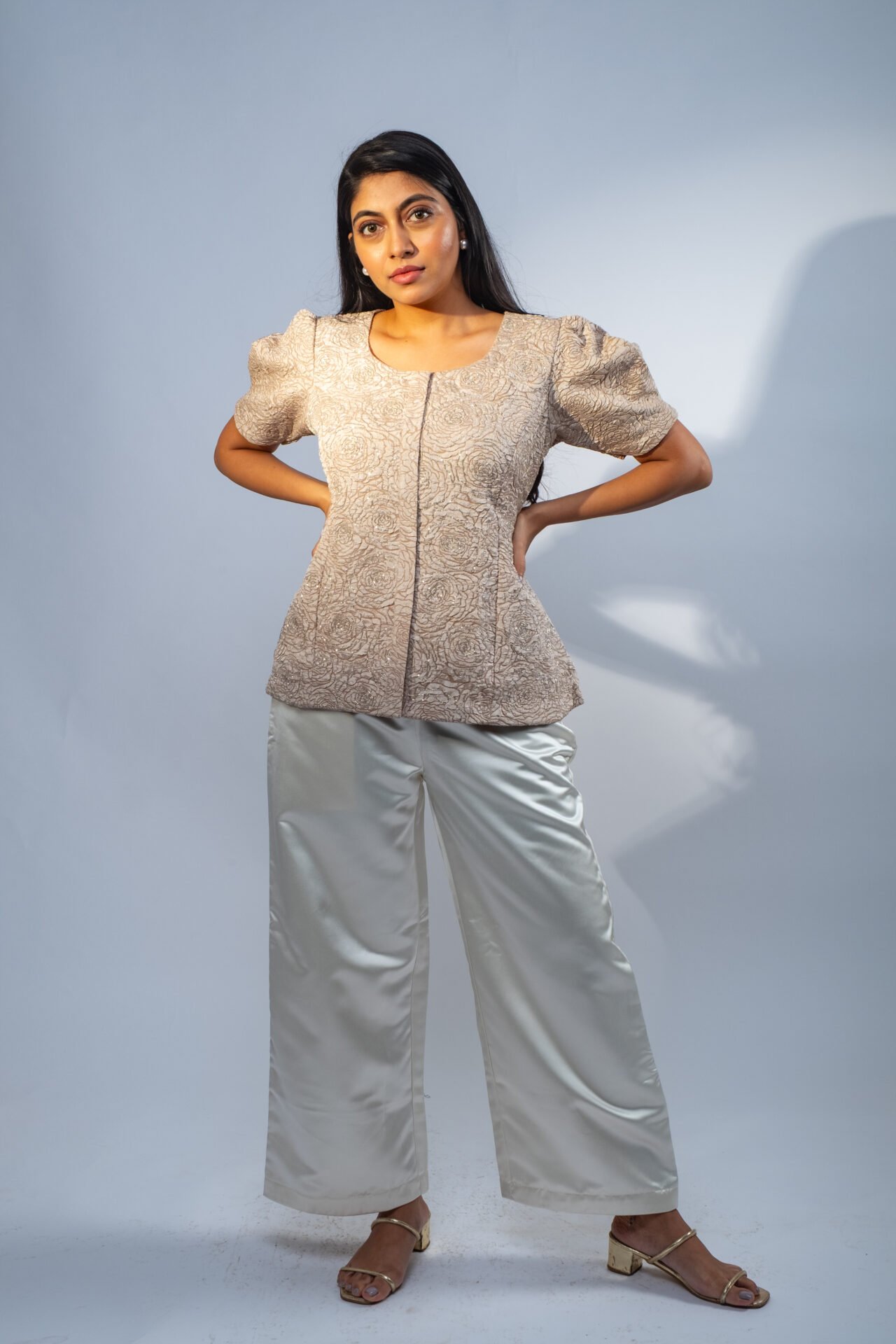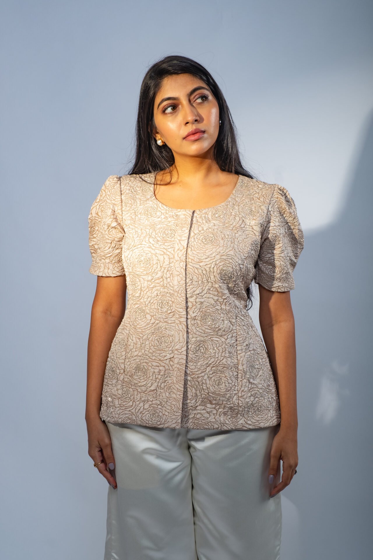 Rose patterned Peplum Top with Cutdana embroidery. A captivating blend of Sophistication and Allure. Crafted from Silk, this top is designed to make a statement at any occasion.