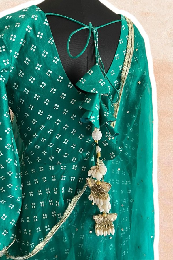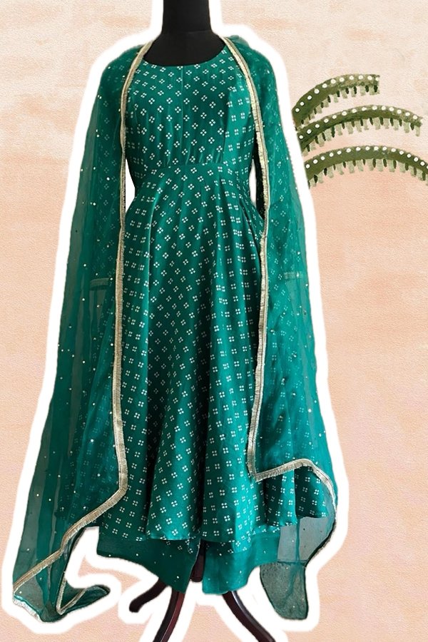 Teal Bandhej Print Anarkali with Matching Pants Paired with Sheer Organza Dupatta. A captivating blend of Sophistication and Allure. Crafted from Dupion Silk Fabric, this set is designed to make a statement at any occasion.