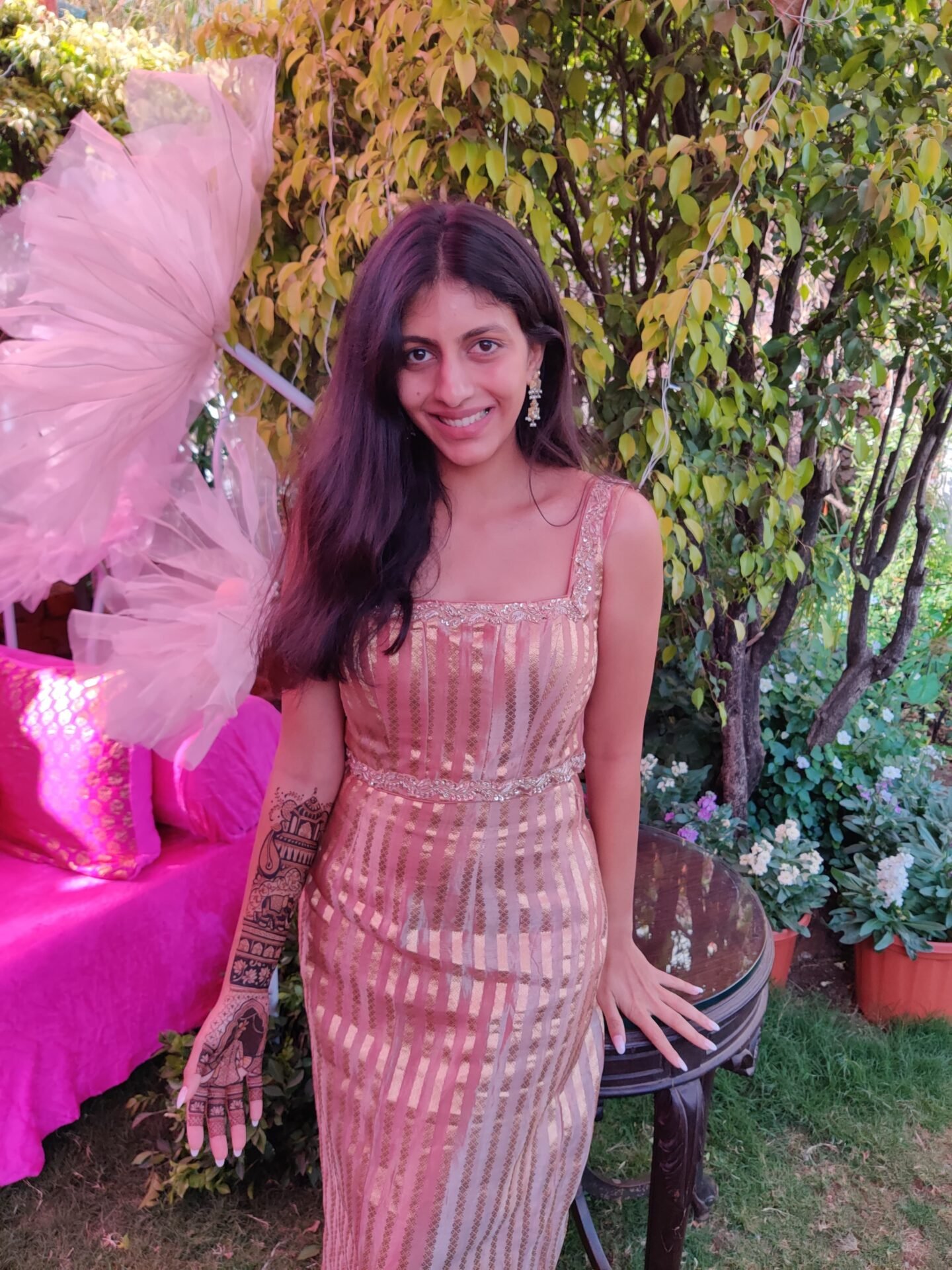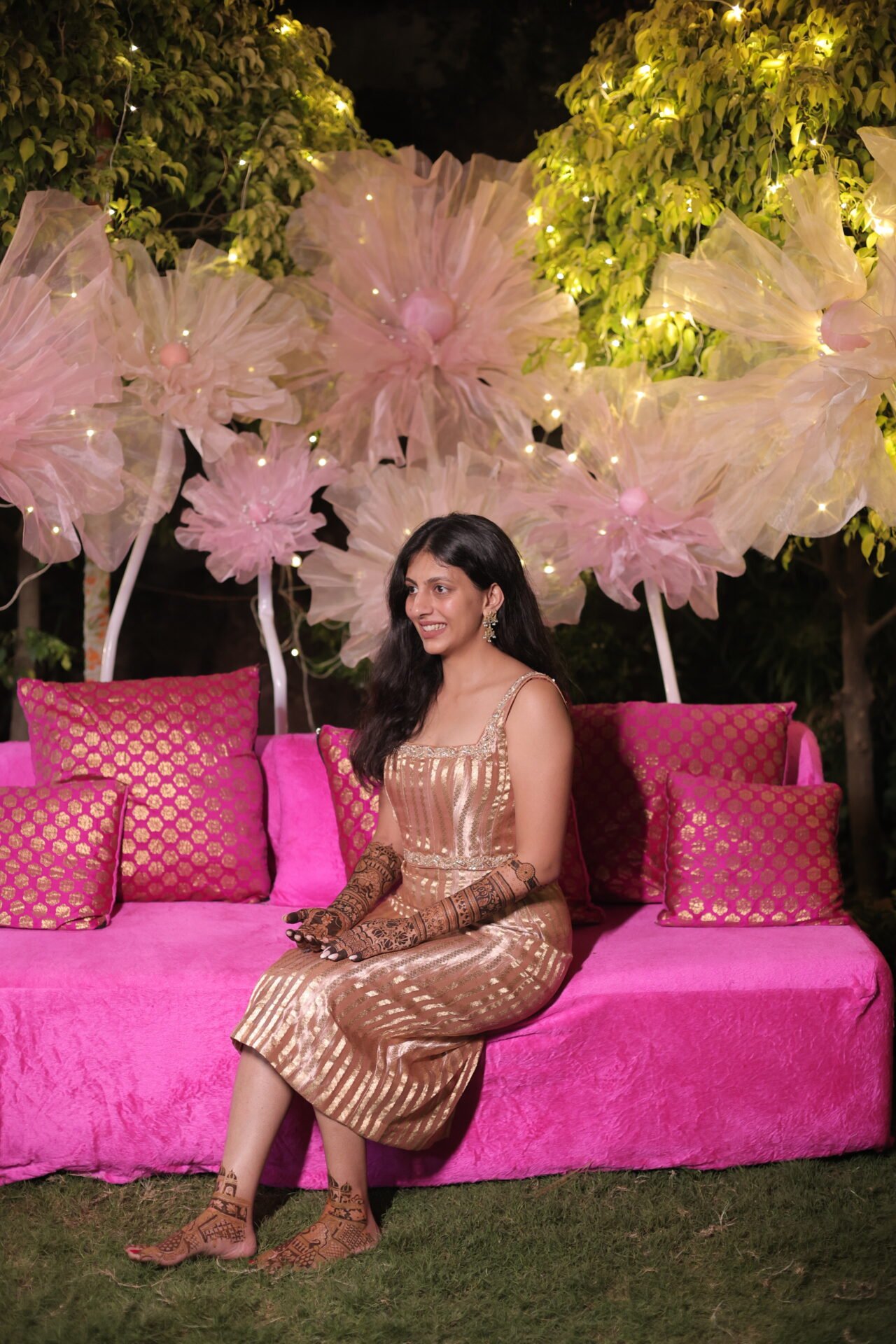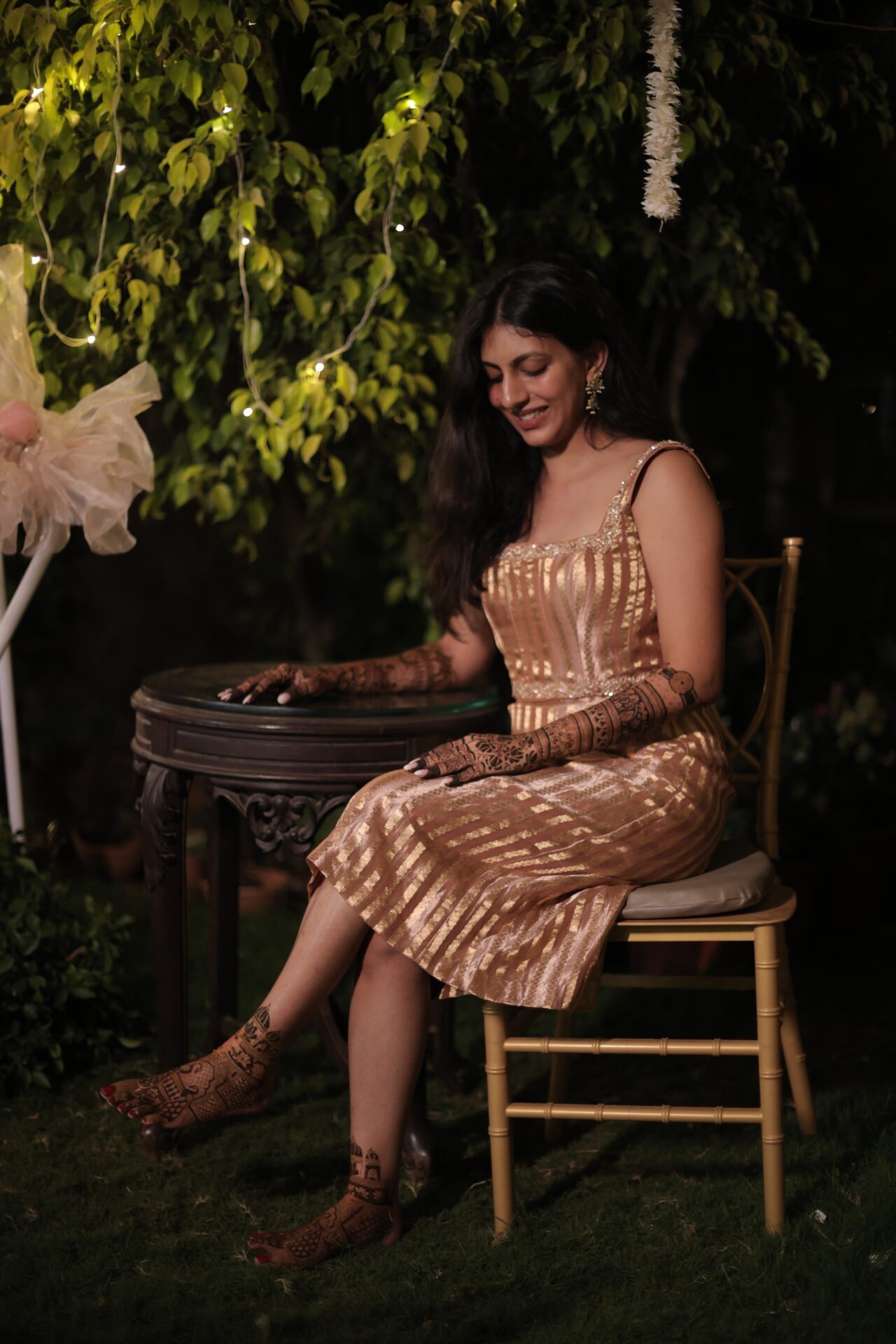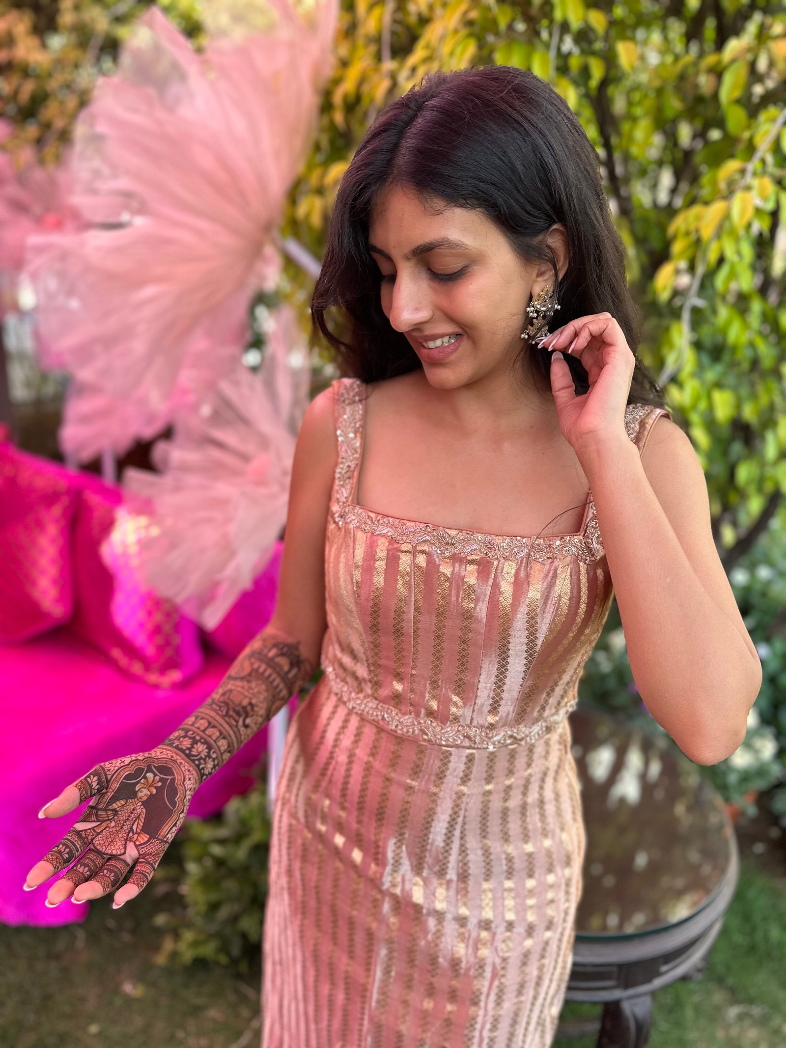 Gold tissue corset & skirt set. A captivating blend of Sophistication and Allure. Crafted from tissue Fabric, this set is designed to make a statement at any occasion.