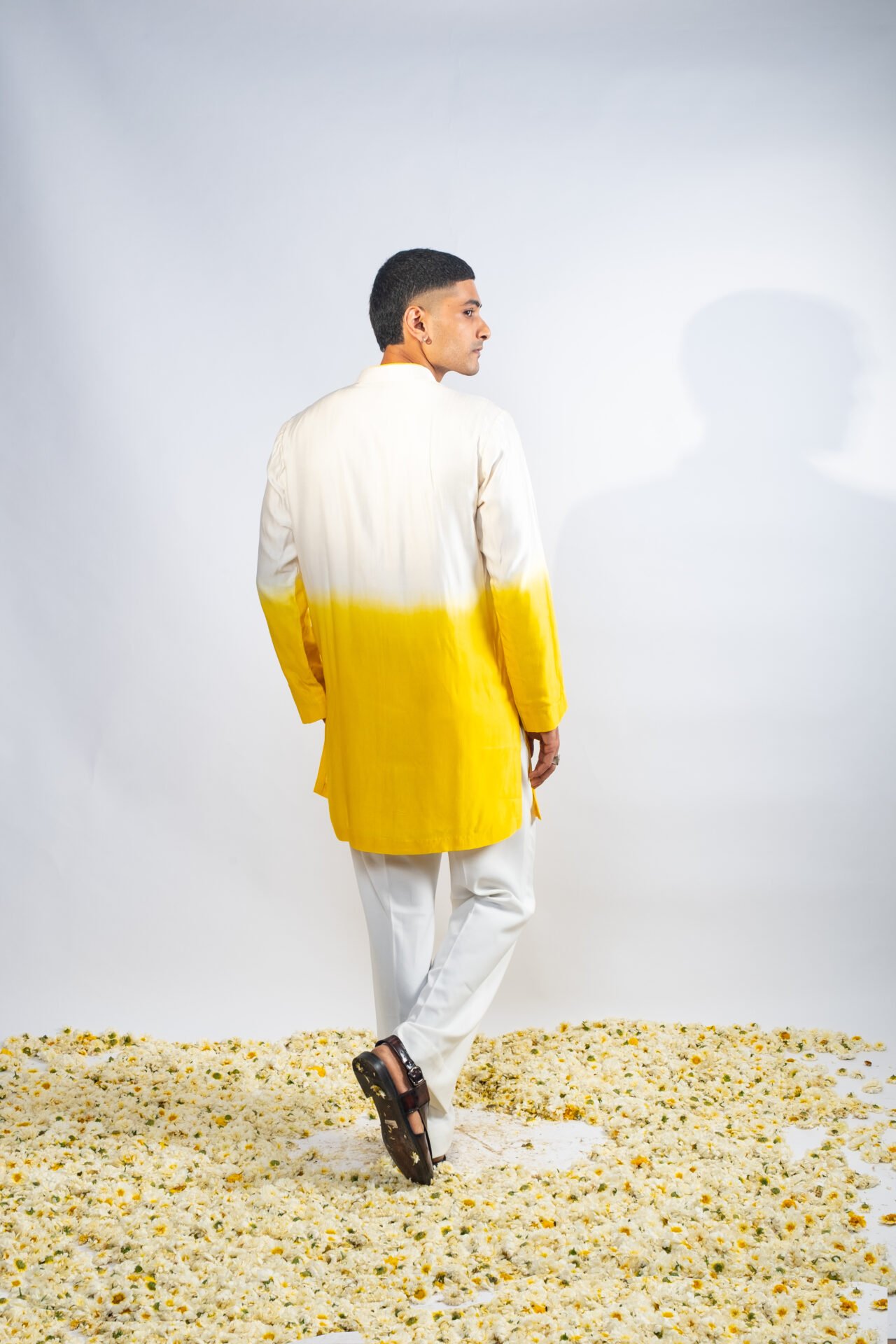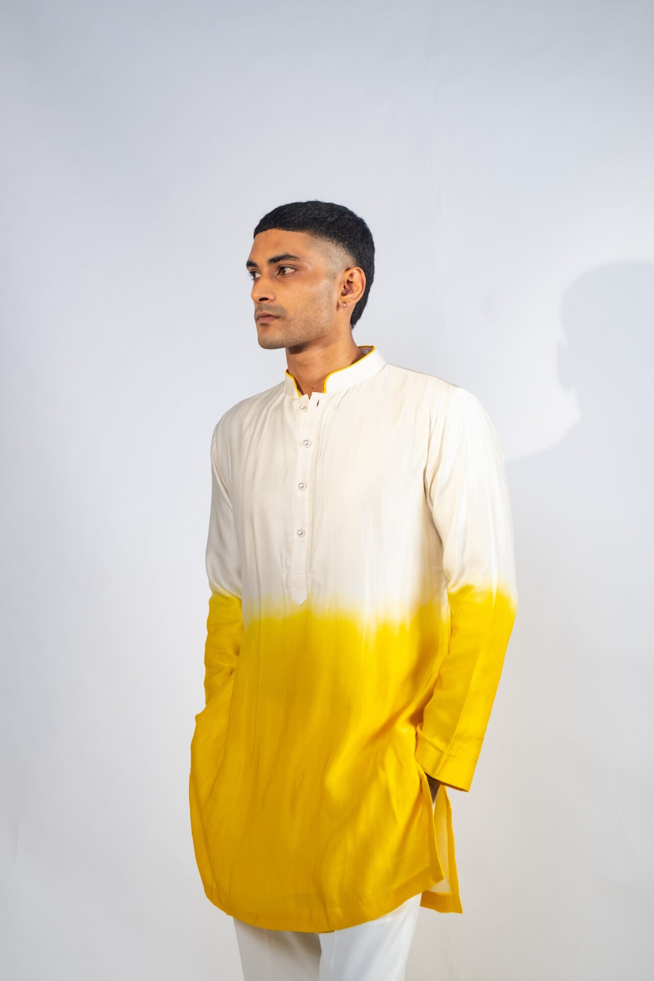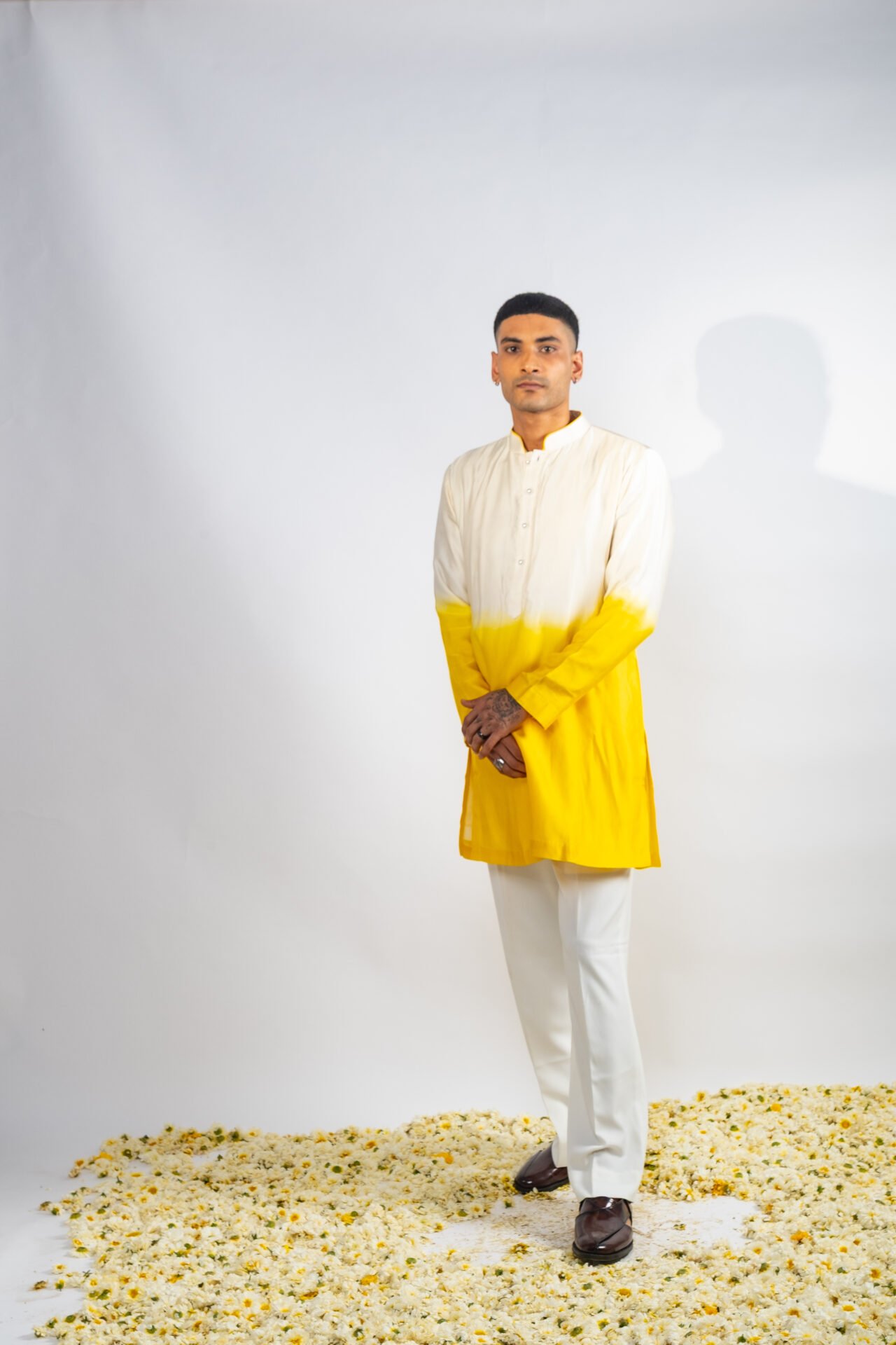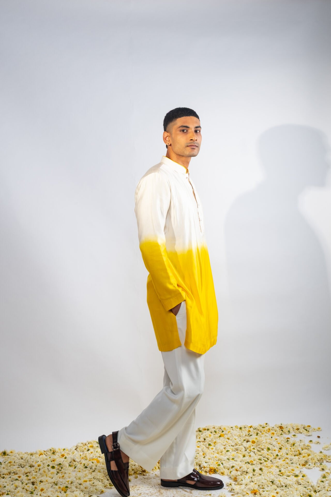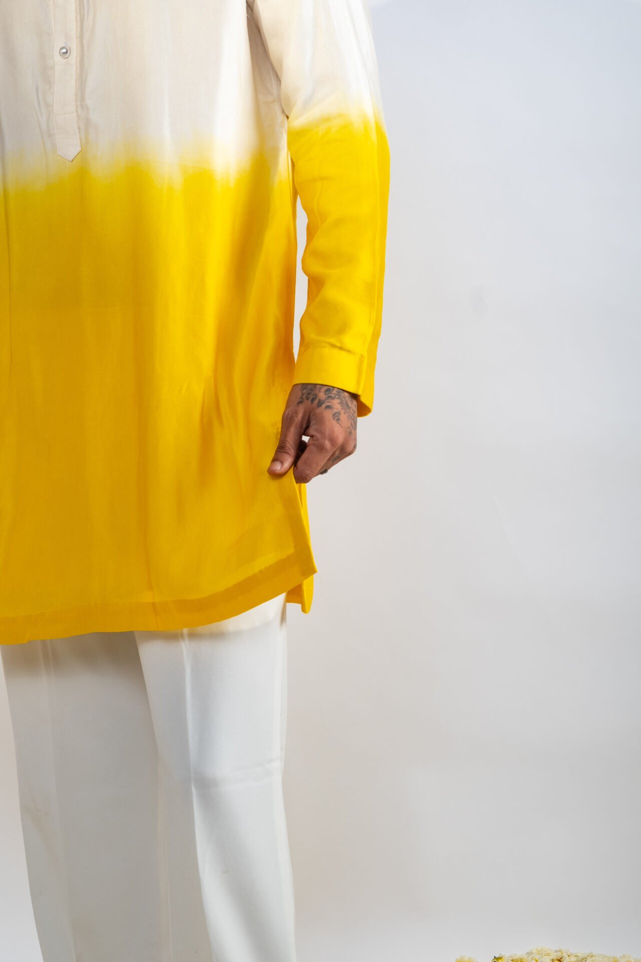 Yellow Ombre Kurta set including short style Kurta paired with Off White wide leg trousers.
